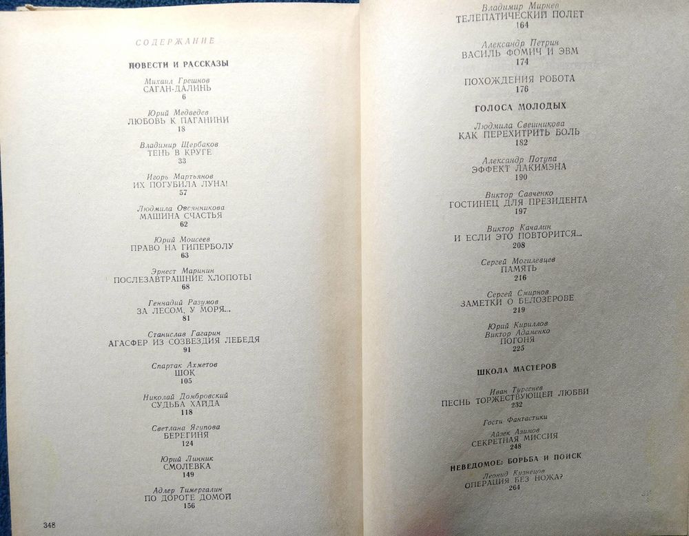 В сборник вошли произведения писателей: М. Грешнова "Саган-Далинь", Ю. Медведева "Любовь к Паганини", В. Щербакова "Тень в круге", И. Мартьянова "Их погубила Луна!", Л. Овсянниковой "Машина счастья", Ю. Моисеева "Право на гиперболу" и многих других.