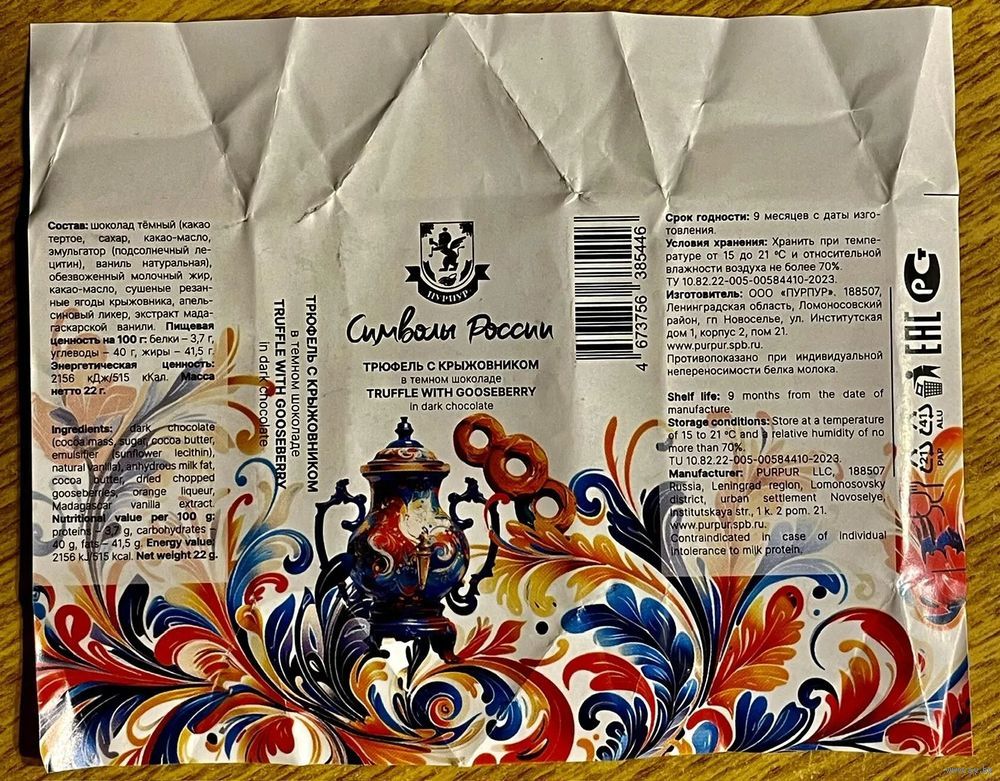 Фантик/обертка от конфеты "Символы России" Россия КФ Санкт-Петербурга ПУРПУР