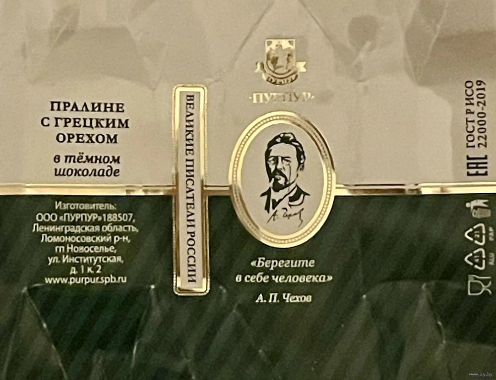 Фантик/обертка от конфеты "Великие писатели России" А. Чехов Россия КФ Санкт-Петербурга ПУРПУР
