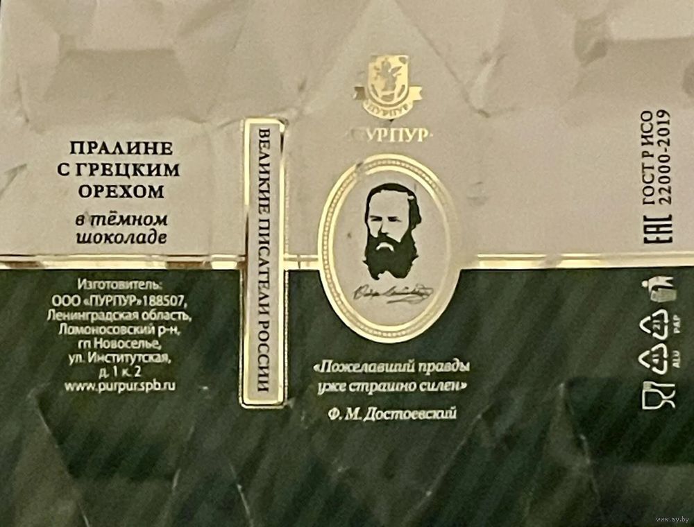 Фантик/обертка от конфеты "Великие писатели России" Ф. Достоевский Россия КФ Санкт-Петербурга ПУРПУР
