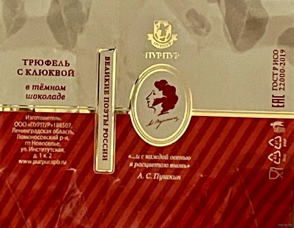 Фантик/обертка от конфеты "Великие поэты России" А. Пушкин Россия КФ Санкт-Петербурга ПУРПУР