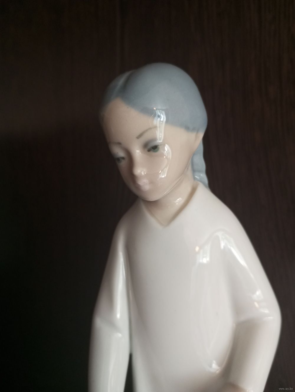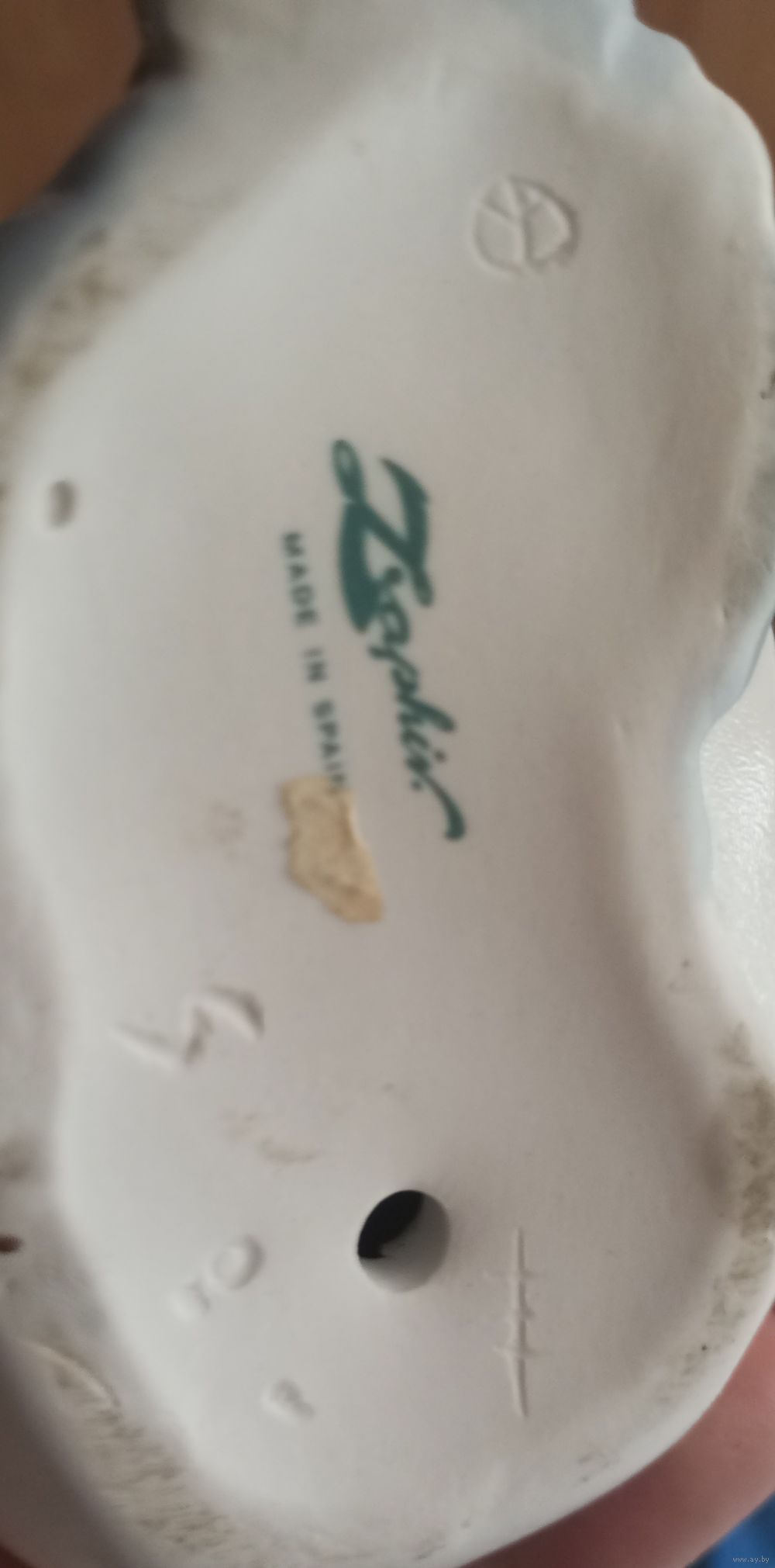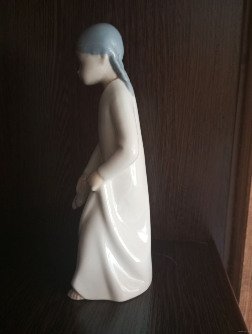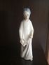 Винтажная фарфоровая статуэтка испанской фирмы, изображающая девушку в белом платье с обувью в руках.