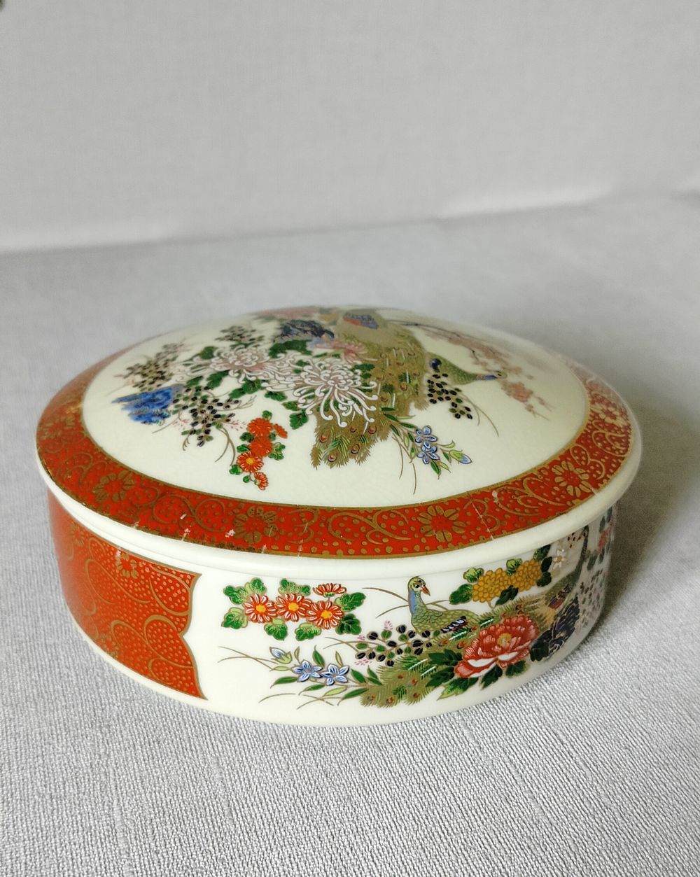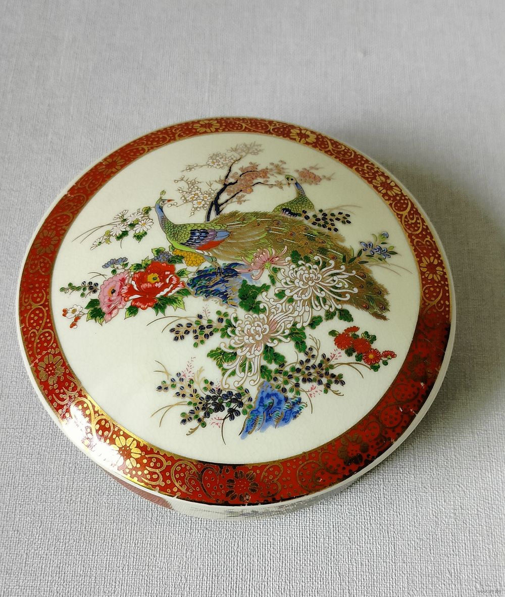 Фарфоровая шкатулка Satsuma Japan 80 гг с изображением павлина, символом счастья и благополучия в семье. Отделка 22-каратным золотом. Сохранность идеальная. Диаметр 16 см, высота 7 см.