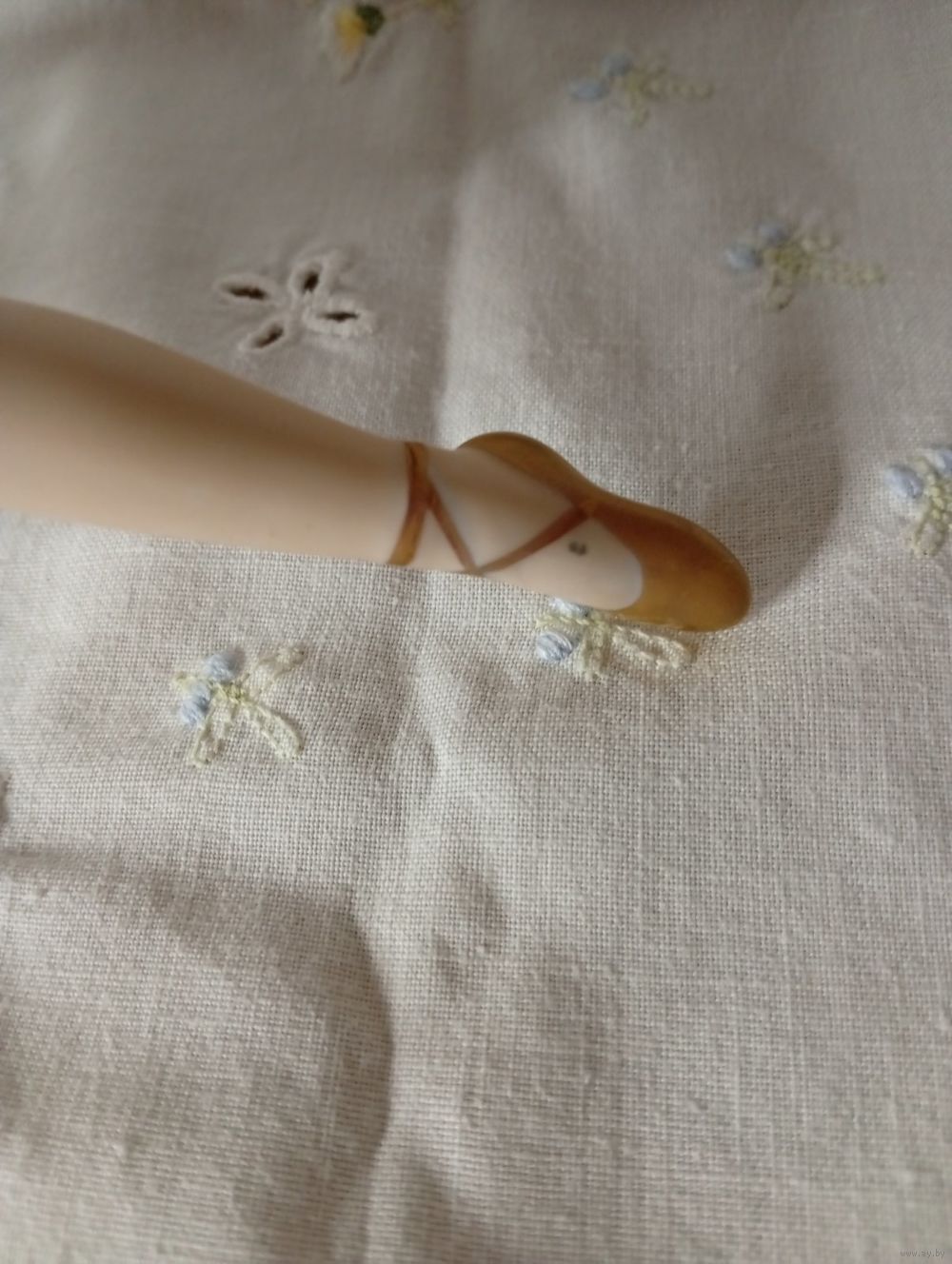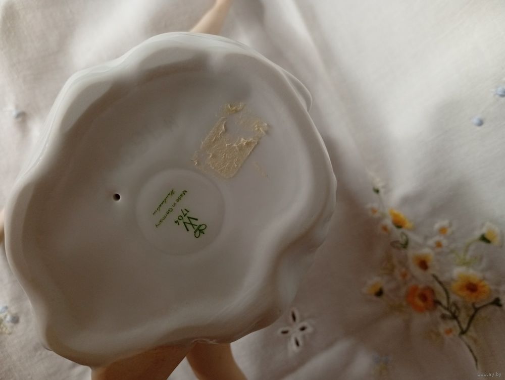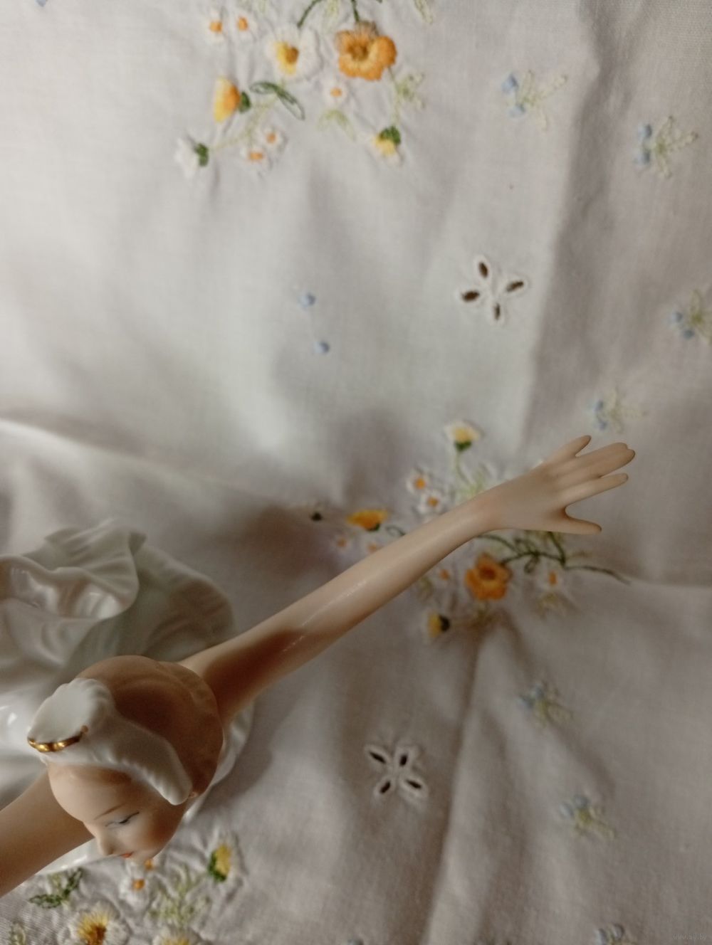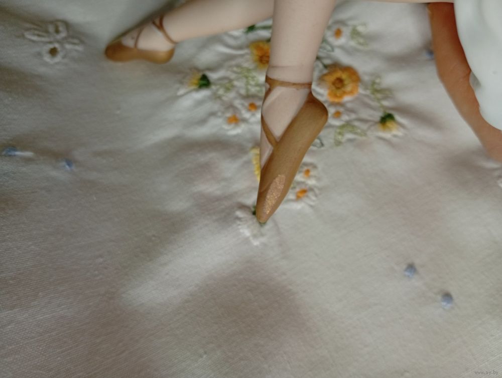 Целая, без реставраций, все пальцы на месте. На одной ноге снизу у пуанта есть темное пятнышко, на второй похоже на производственный скол, покрытый краской при росписи.