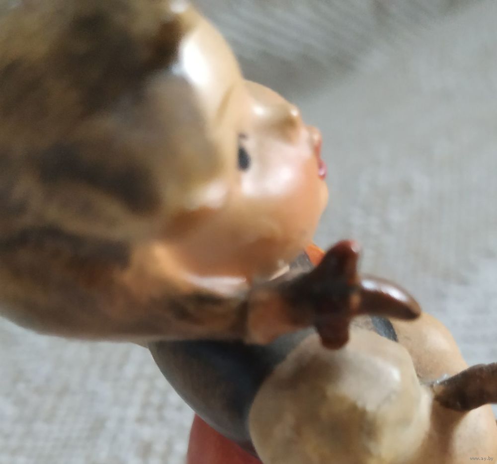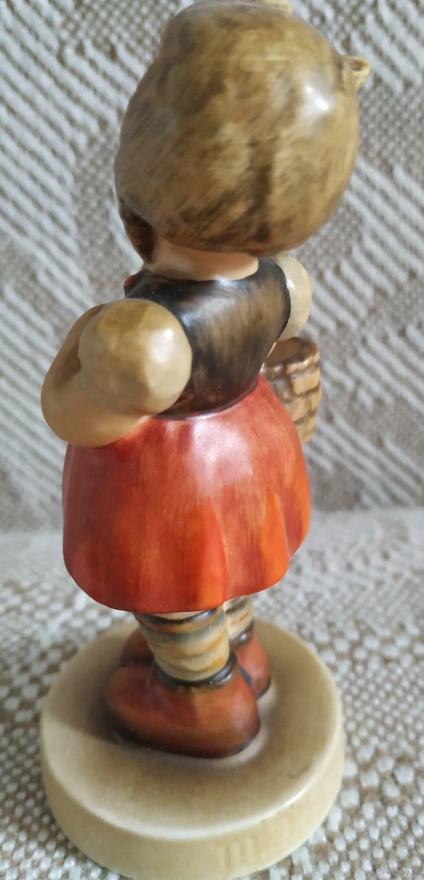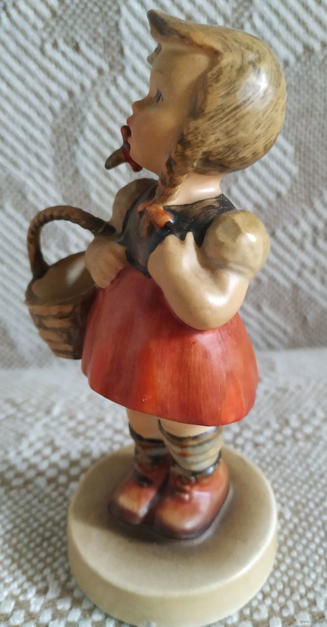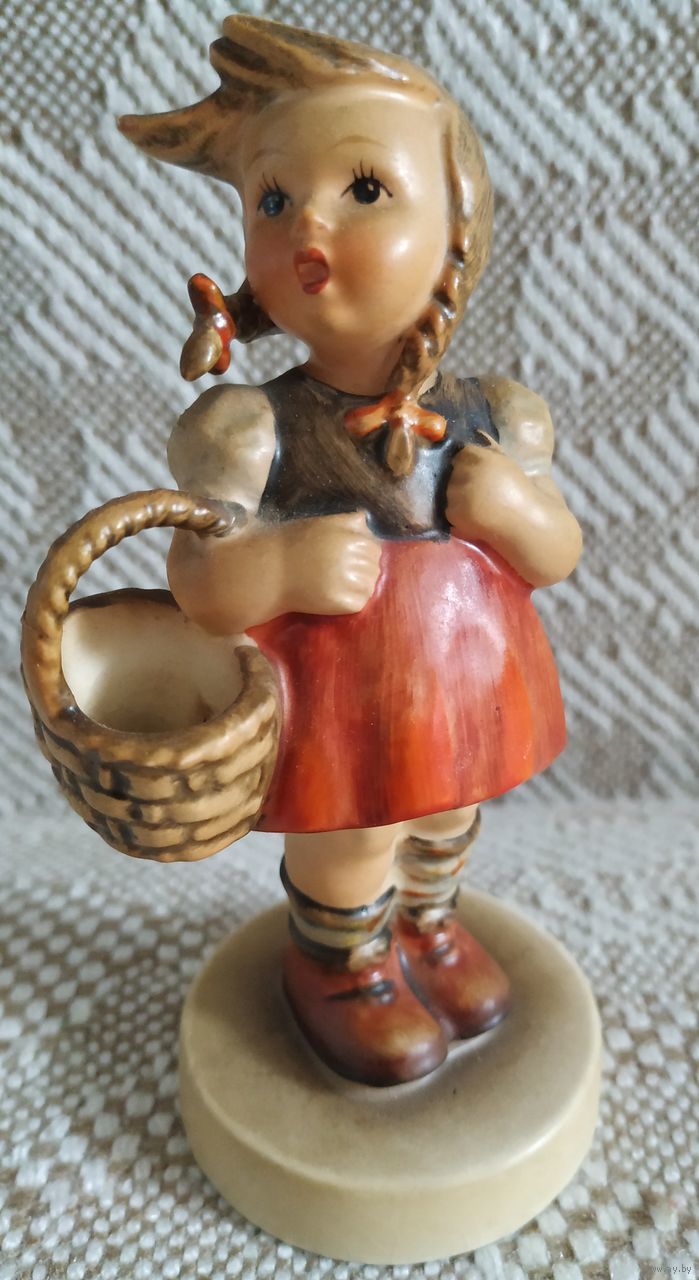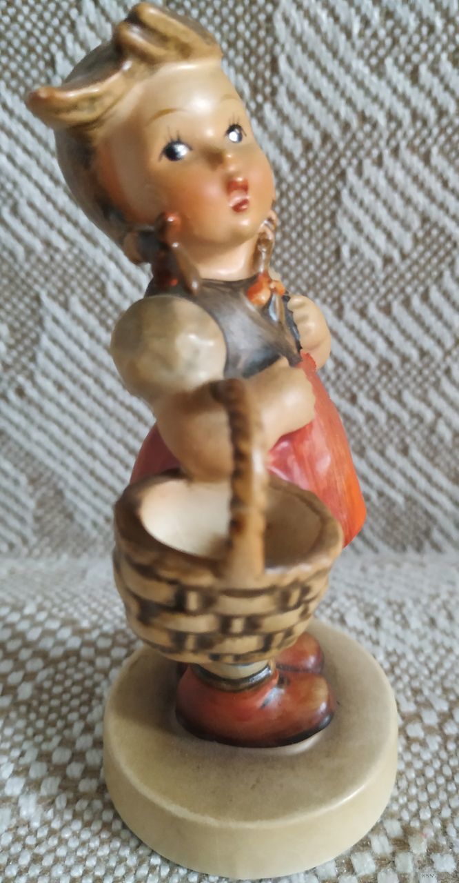 Это фарфоровая статуэтка Goebel Hummel «Маленькая покупательница» (Little Shopper), модель #96, изображающая девочку с корзиной. Дизайнер: Райнхольд Унгер (на основе рисунков сестры Марии Иннокентии Хуммель). Высота 12 см. Склейка косички (визуально незаметно см. последнее фото) материал — фарфор с матовым покрытием, ручная роспись.