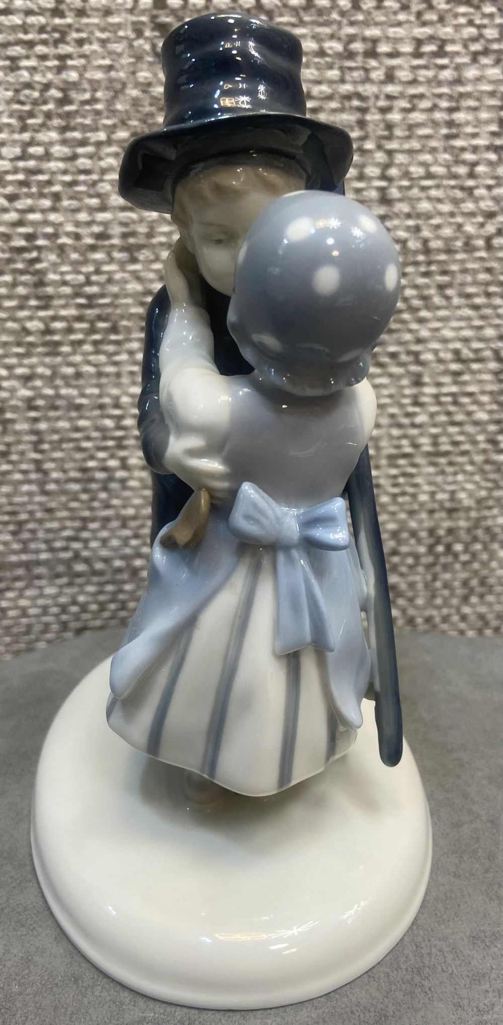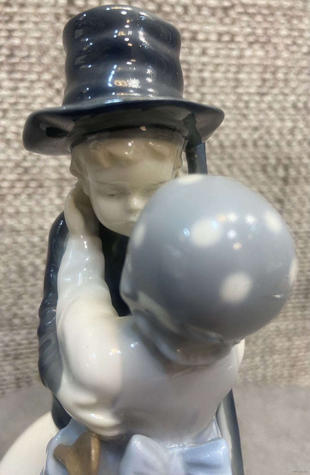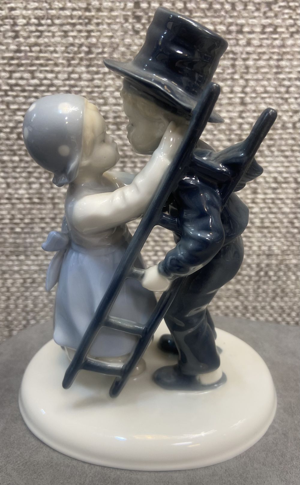 Эта фарфоровая статуэтка изображает мальчика-трубочиста с лестницей и девочку в фартуке и чепце. Они стоят напротив друг друга, будто собираясь поцеловаться. Статуэтка произведена немецкой компанией Metzler &