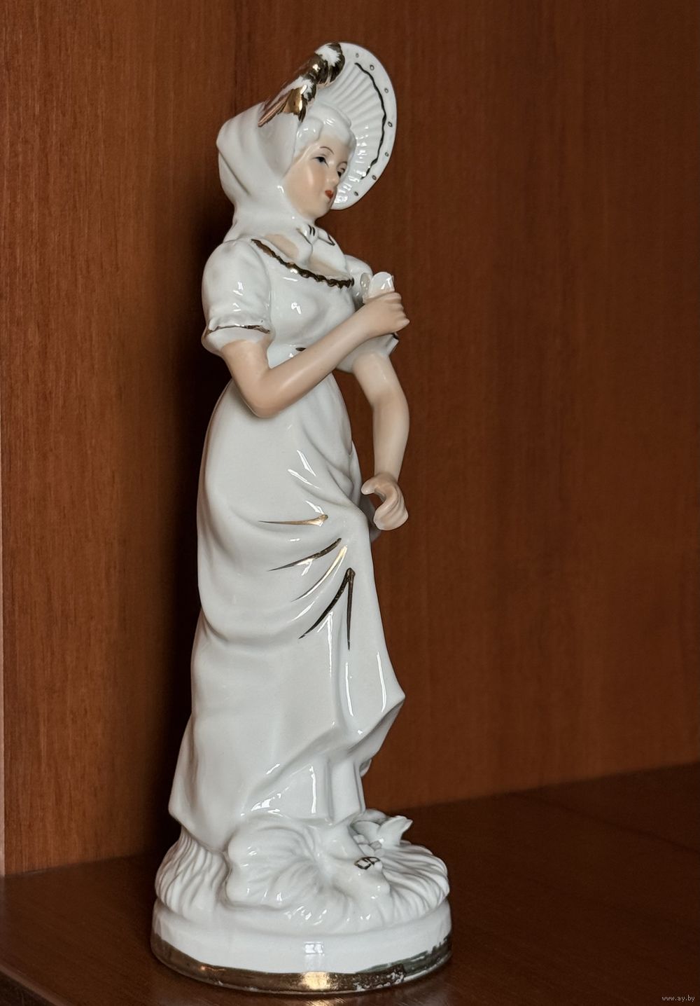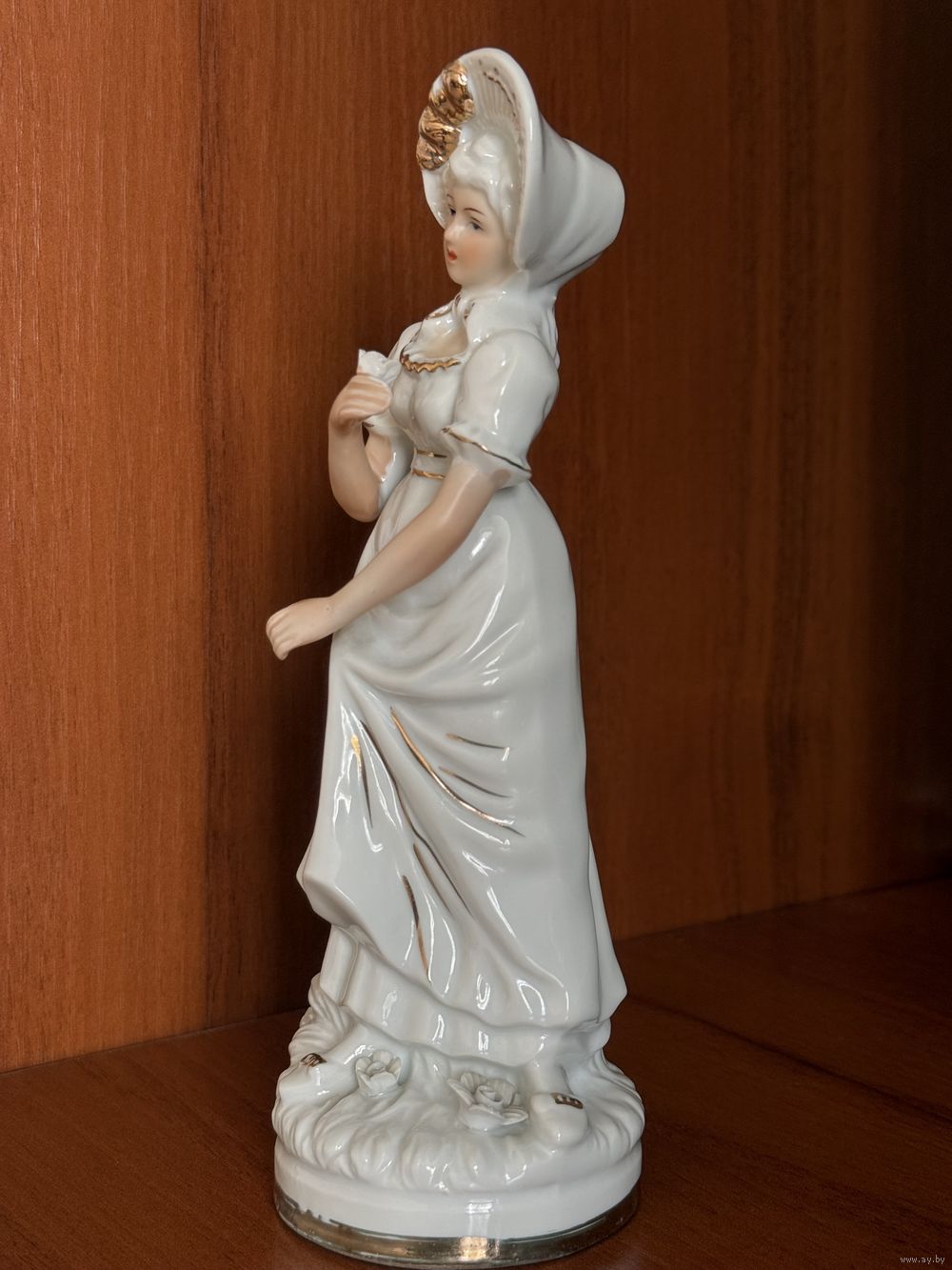 Статуэтка изображает элегантную молодую даму в струящемся белом платье, украшенном деликатной золотой отделкой. Характерный фасон платья с завышенной талией, короткими рукавами-фонариками и мягкими, ниспадающими складками подола свидетельствуют об эпохе начала XIX века (период Ампир, 1800–1820 годы). Высокая шляпка (капор), завязанная под подбородком, была писком моды того времени и завершала образ благородной дамы.