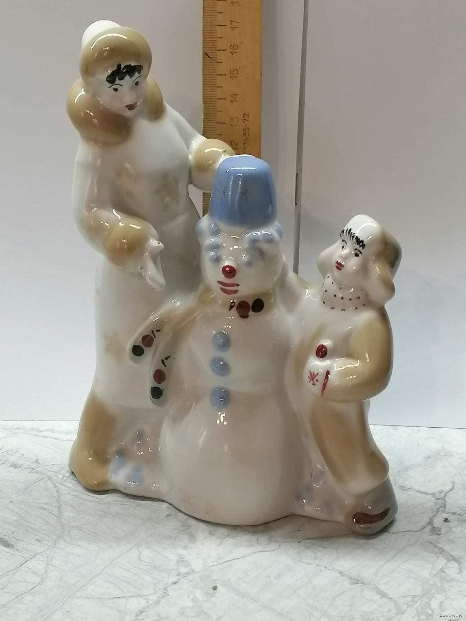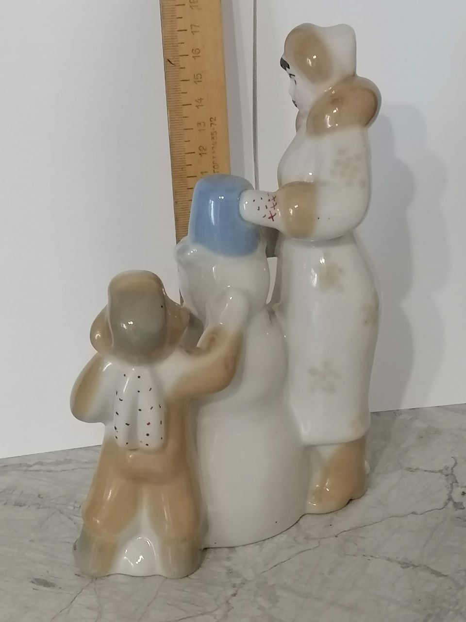 Фарфоровая статуэтка Снеговик или Мама с ребенком лепят снеговика. Зимний дворик.