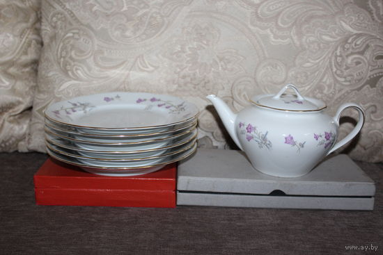 Диаметр тарелок-19 см., высота чайника -11.5 см. Посылки высылаю один раз в неделю.