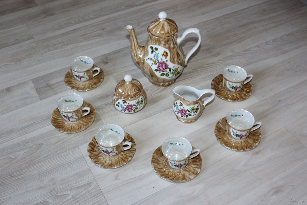 Диаметр чашки 6,4 см., высота 5,4 см., диаметр тарелочки 11 см., высота чайника с крышкой 21 см., внутренний диаметр 5,7 см., высота сливочника 9,5 см., диаметр 5 см., высота сахарницы с крышкой 10,5 см., внутренний диаметр 5 см.