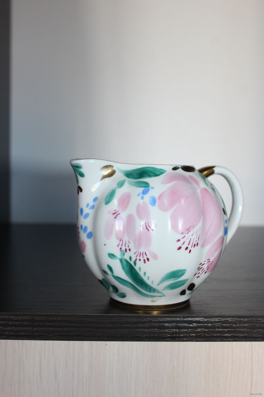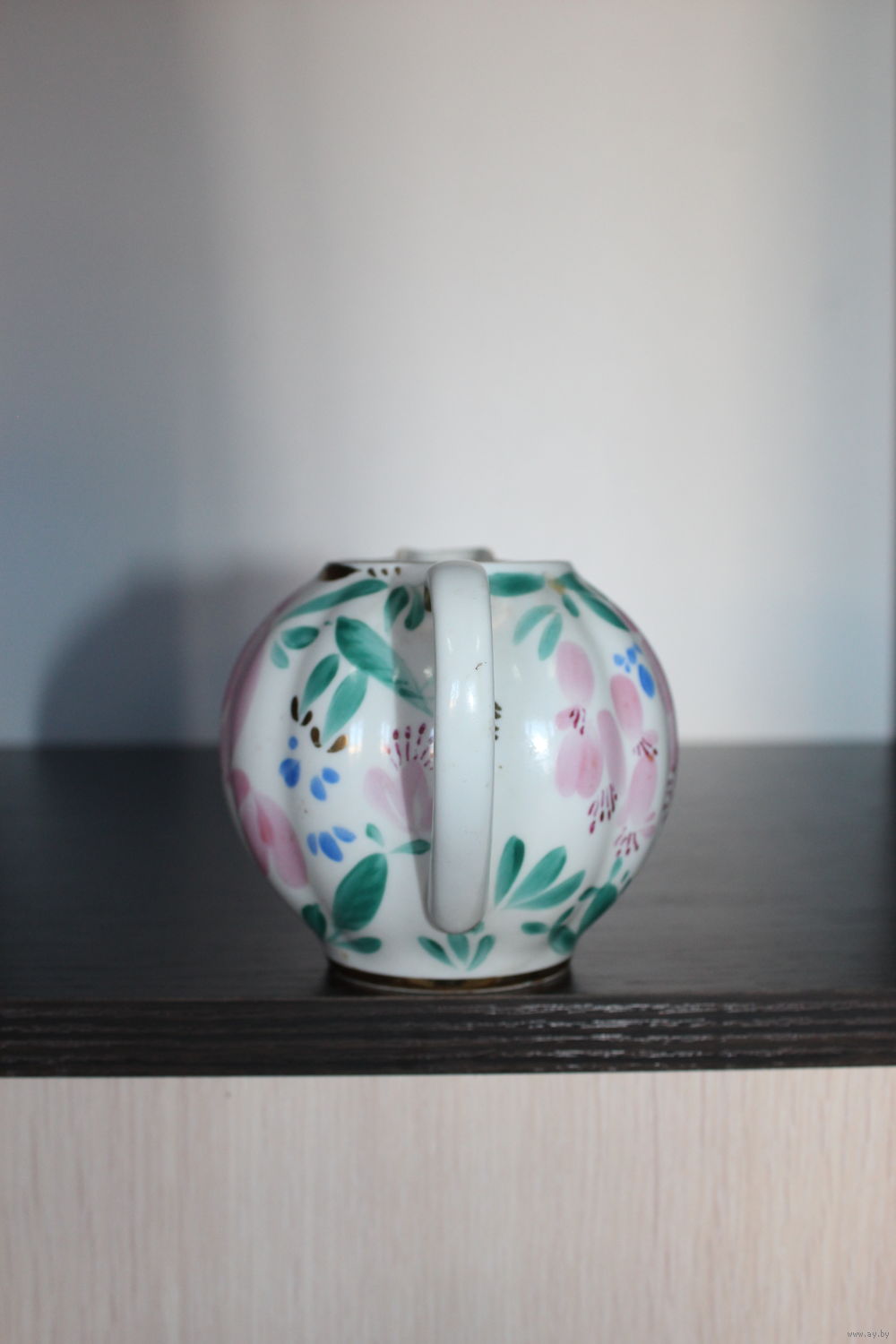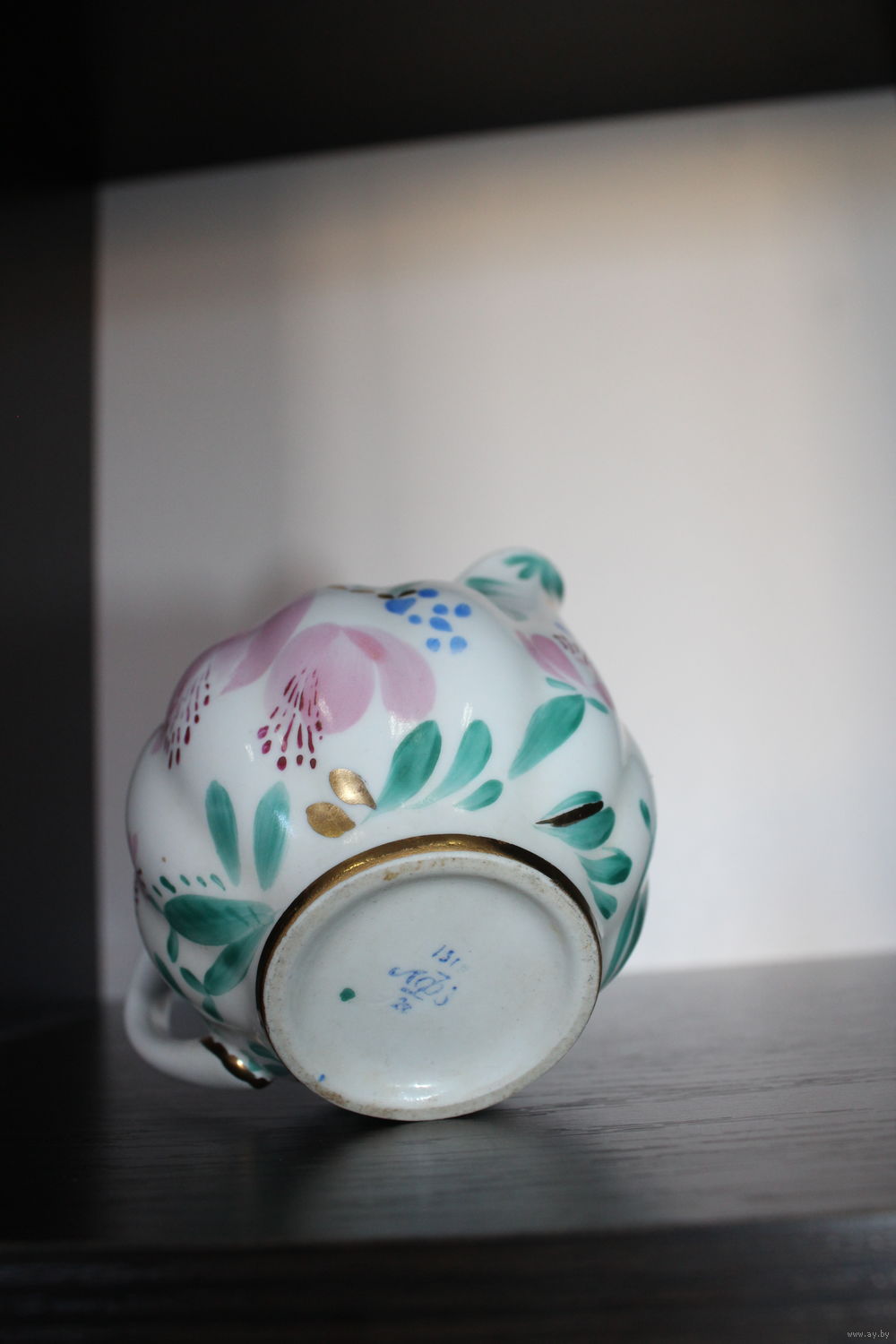 Фарфоровый сливочник , без сколов, небольшие потертости позолоты, высота 8,5 см, диаметр 4,5 см, клеймо.