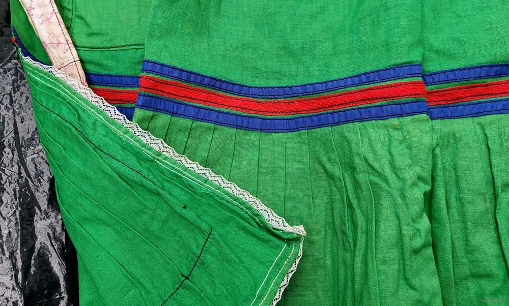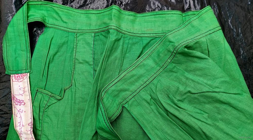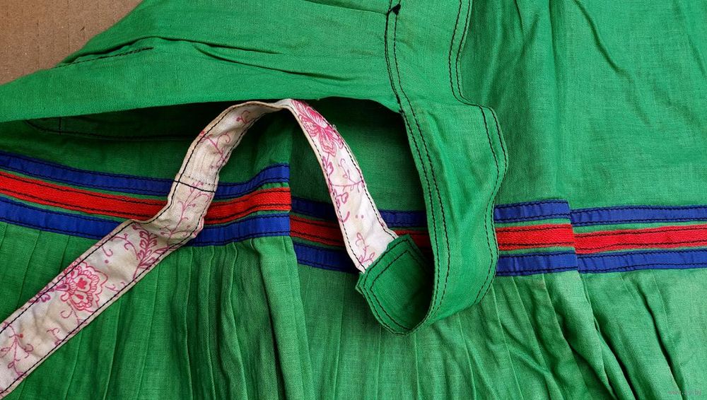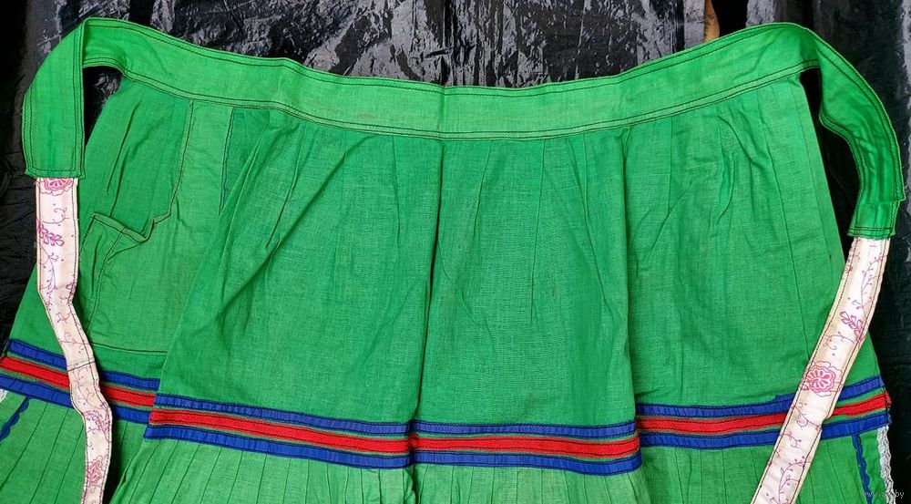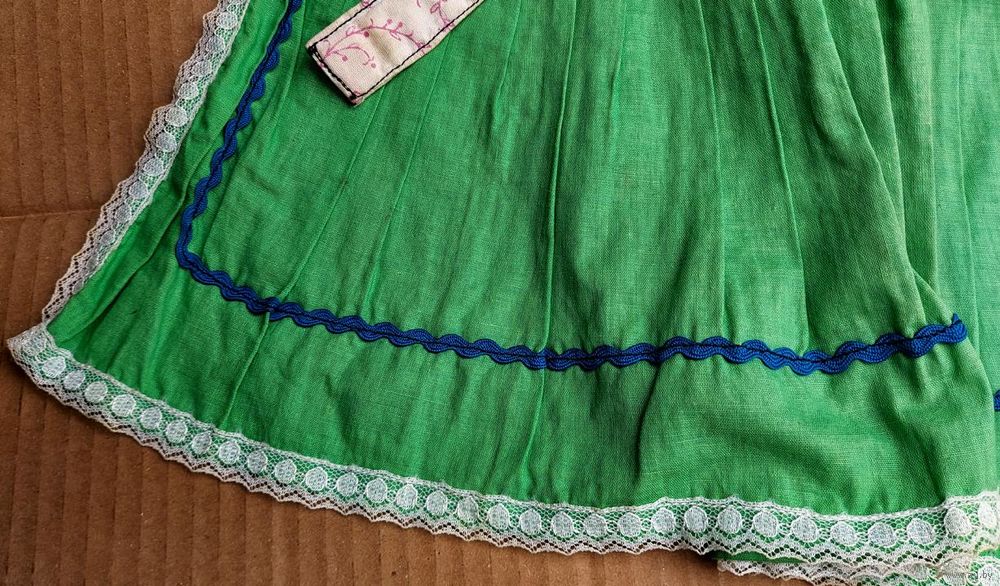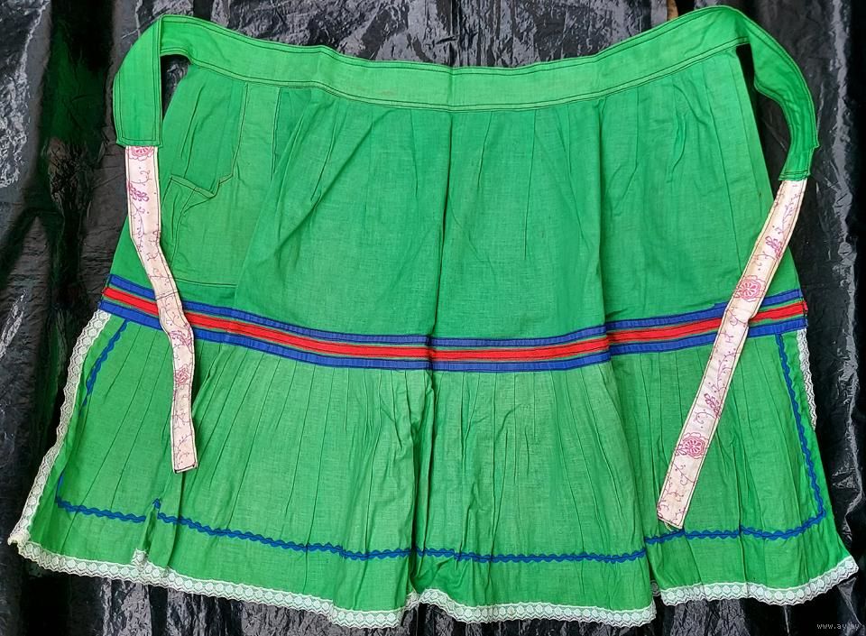 Фартук пошит в конце 1930-х годов. Хорошее состояние, у правого края несколько малюсеньких темных пятнышек около 3-5 мм. В реальности цвет полотна и лент чуть темнее, более насыщенный, ближе всего как на крупных фотографиях.