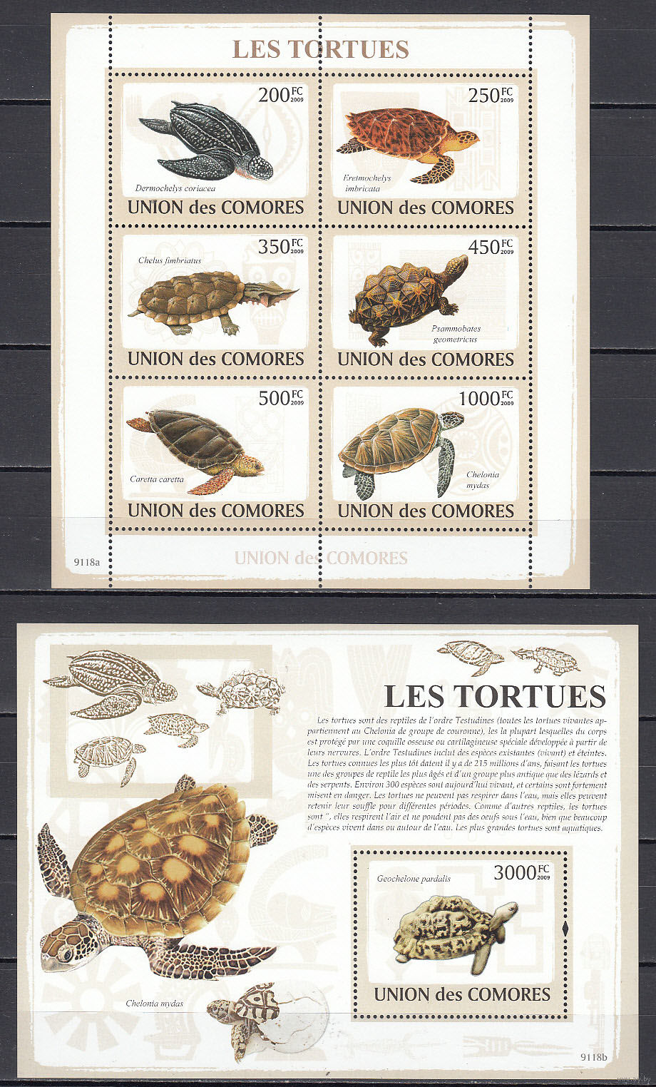 Фауна. Черепахи. Коморы. 2009. 1 малый лист и 1 блок. Michel N 2121-2126, бл475 (26,0 е).