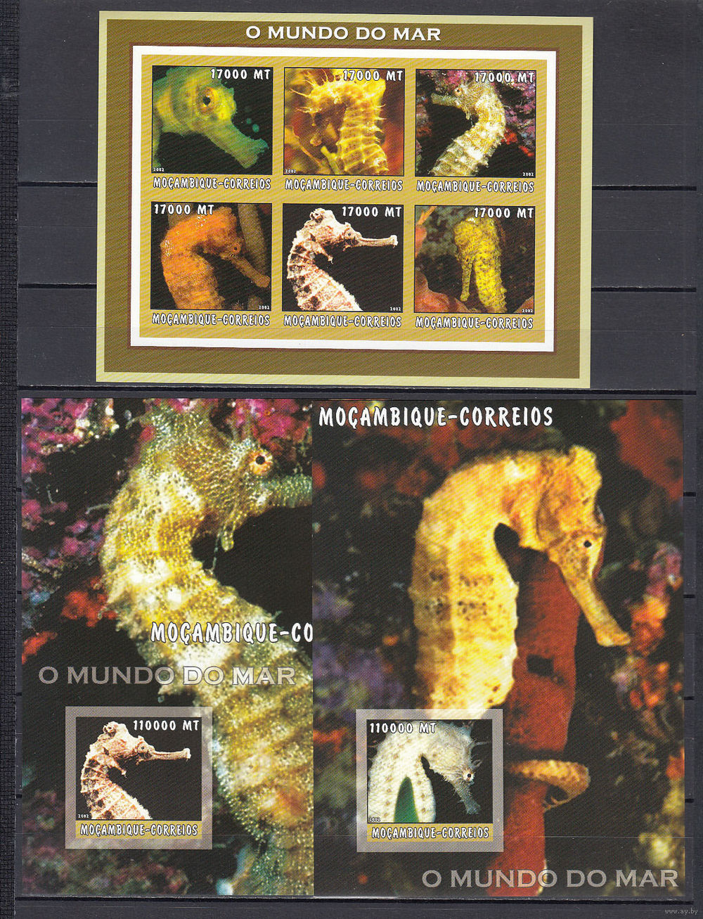 Фауна. Мир моря. Морские коньки. Мозамбик. 2002. 1 малый лист и 2 блока б/з. Michel N 2566-2721, бл168-192 (39,0 е)