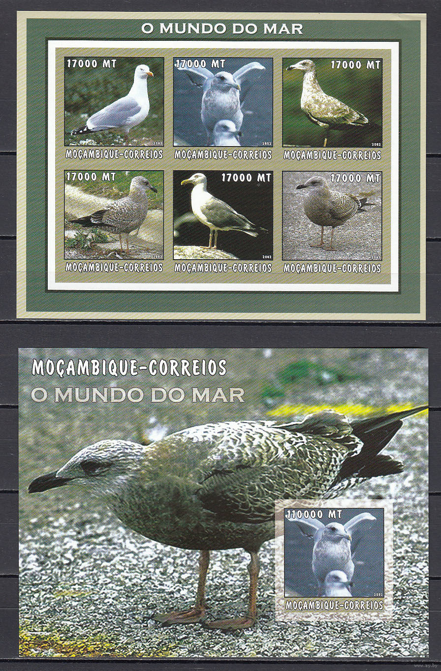 Фауна. Мир моря. Птицы. Мозамбик. 2002. 1 малый лист и 1 блок б/з. Michel N 2566-2721, бл168-192 (26,0 е)
