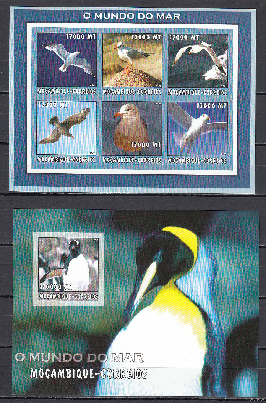 Фауна. Мир моря. Птицы. Мозамбик. 2002. 1 малый лист и 1 блок б/з. Michel N 2650-2655, бл182 (26,0 е)