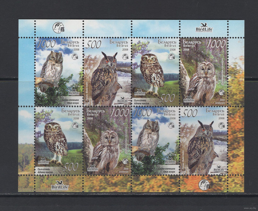 Фауна птицы Беларусь 2008 Малый лист коллекционных марок "Птицы Беларуси Совы"