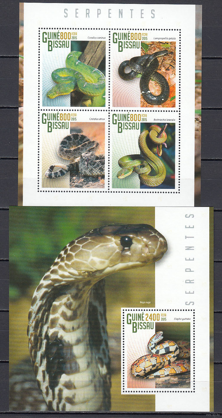 Фауна. Змеи. Гвинея-Бисау. 2015. 1 малый лист и 1 блок. Michel N 7571-7574, бл1318 (22,0 е)