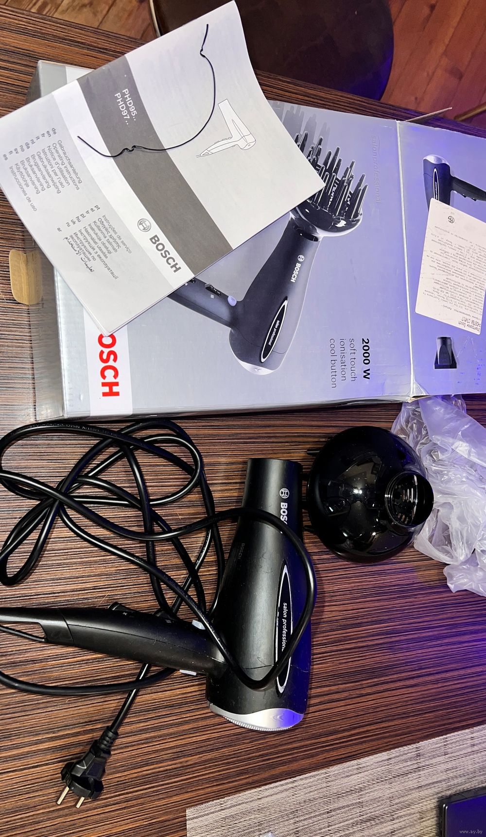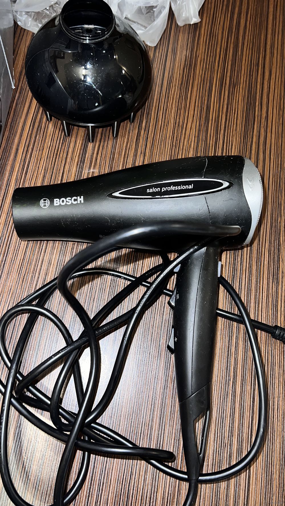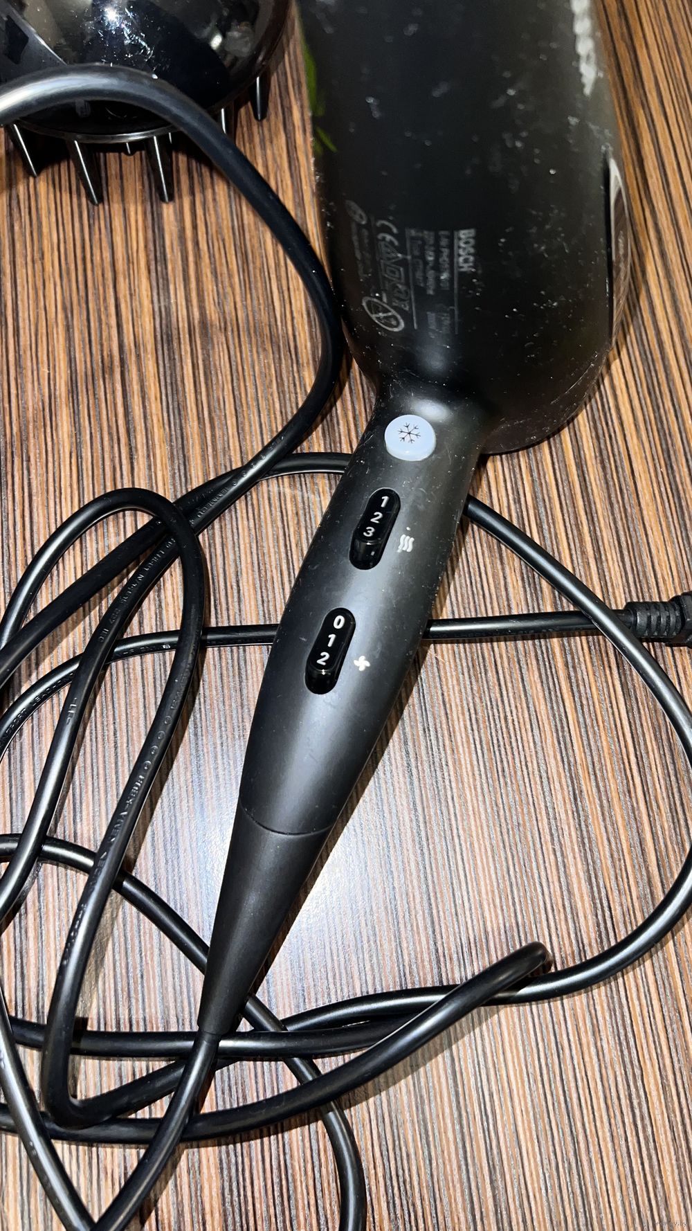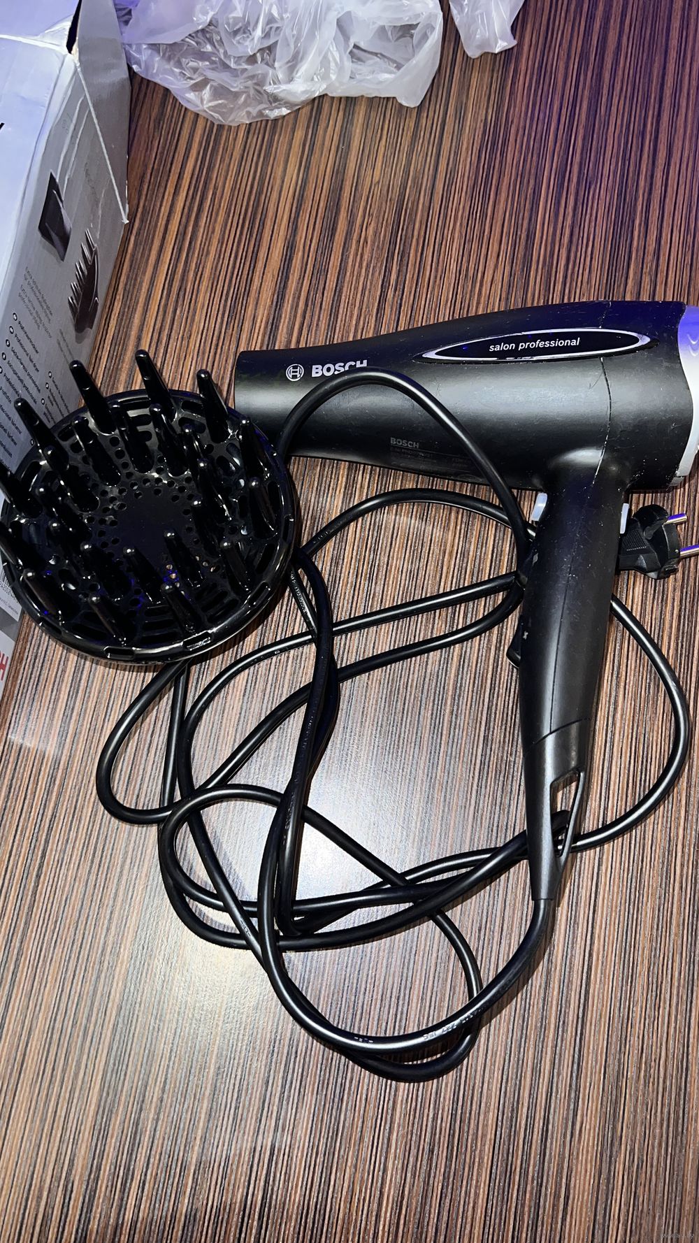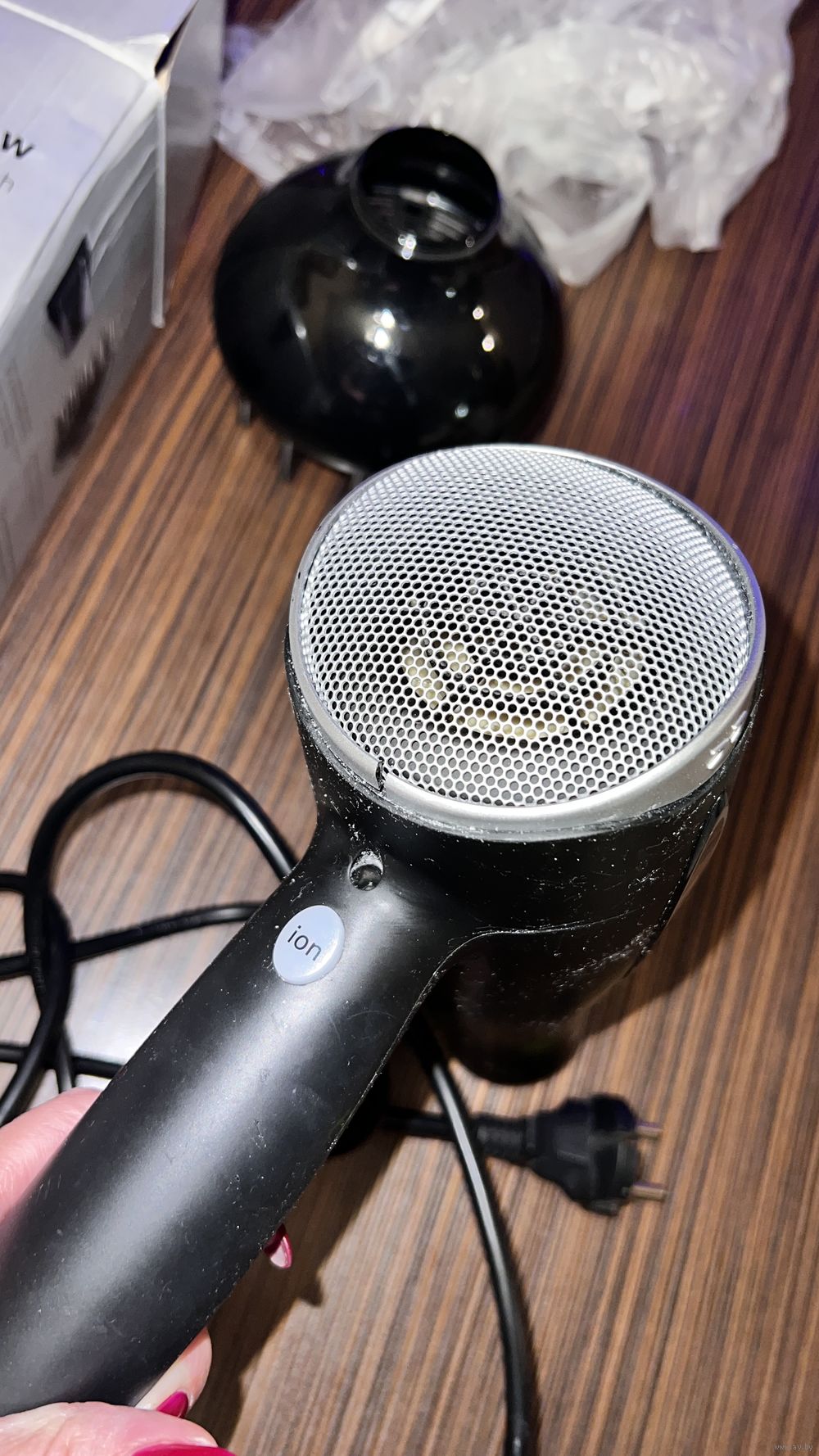 Б\у оч. мало в основном лежал, от времени пластик стал липкий( есть способы отчистить, не хочется заниматься). Работает как зверь, режим ионизации, теплый-холодный воздух, оч. мощный. Небольшая трещинка сзади на ободке возле сетки, видно на фото.