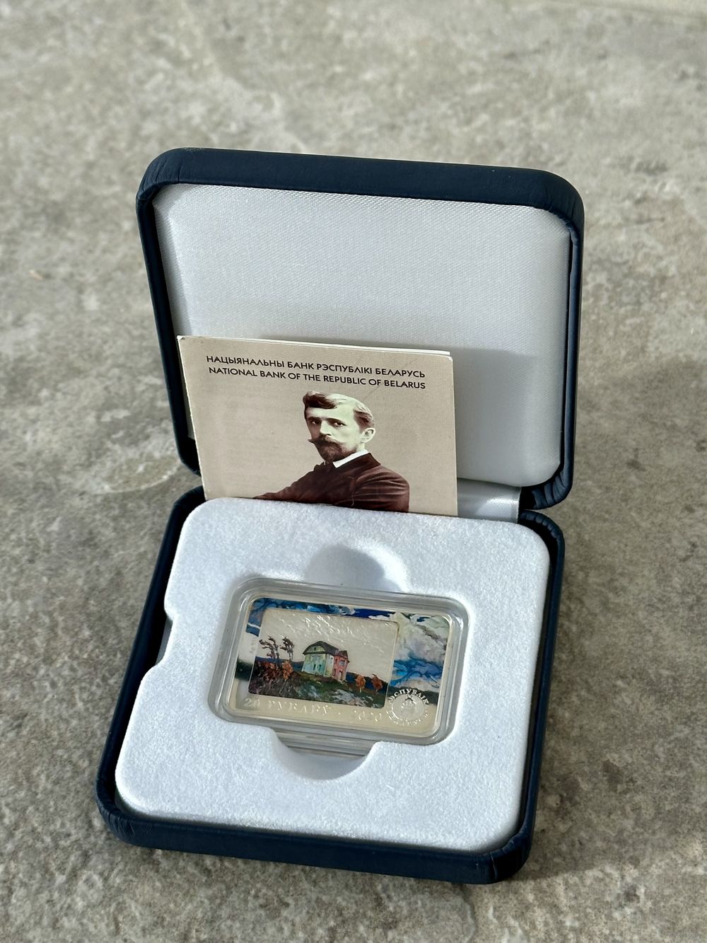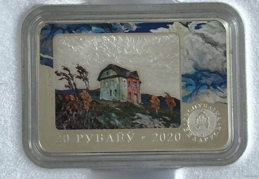 справа внизу – рельефное изображение Государственного герба Республики Беларусь; вокруг него надпись: РЭСПУБЛІКА БЕЛАРУСЬ; в центре – фрагменты картины художника Фердинанда Рущица "Пустырь. Старое гнездо", выполненные с использованием цифровой печати; внизу указан номинал 20 РУБЛЁЎ (на серебряной), год чеканки; слева – проба сплава (на серебряной).