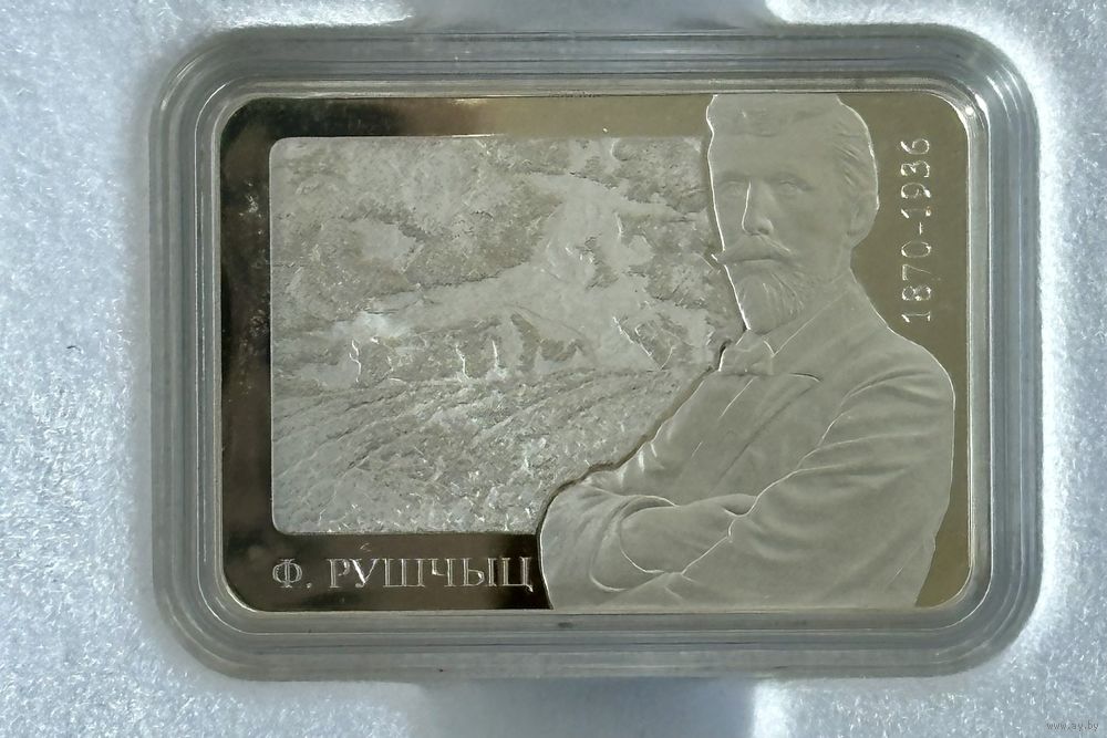 в центре – рельефное изображение фрагмента картины "Земля", справа – портрет Фердинанда Рущица; внизу слева надпись: Ф. РУШЧЫЦ; вверху справа – годы жизни художника: 1870–1936.