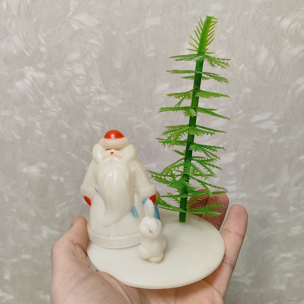 Советская раритетная ретро настольная композиция: фигурка Деда Мороза, зайчик и ёлка.