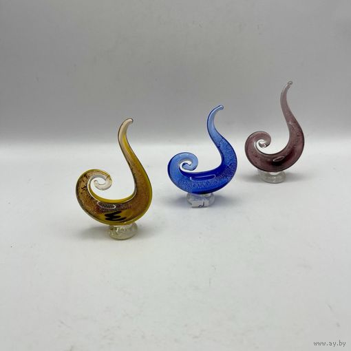 Винтажные декоративные фигурки из муранского (венецианского) стекла полностью ручной работы с добавлением настоящего серебра. Изготовлены по традиционному методу венецианских стеклодувов - выдуванием. Каждое изделие уникально. Италия. 1970-е г.г. Размер 5 х 8 см. Диаметр основания 2 см. В наборе 3 фигурки разных цветов.