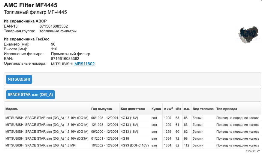 Прямоточный топливный фильтр Kavo parts MF-4445 для MITSUBISHI Space Star (DG_A).