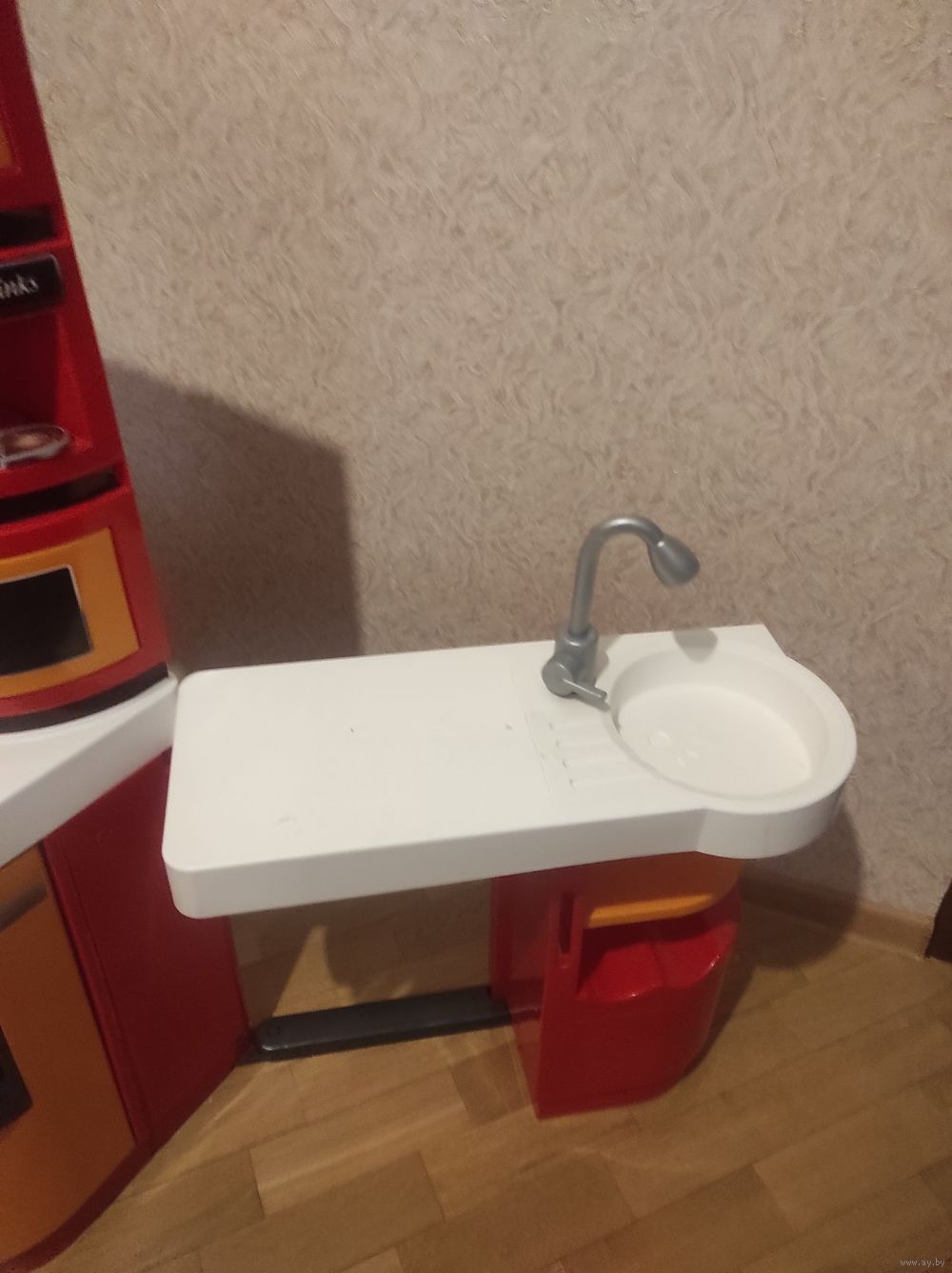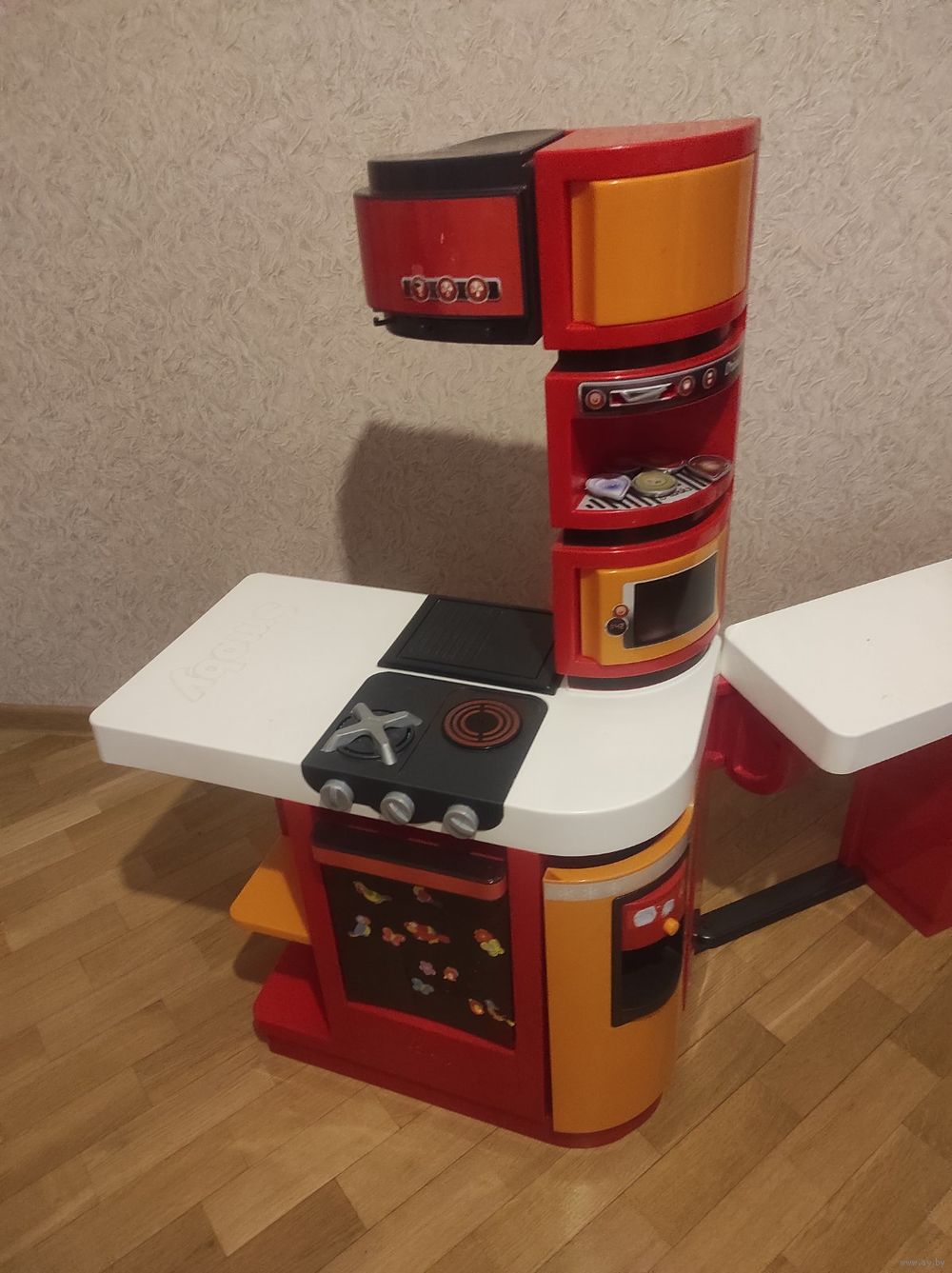 Фирменная кухня Smoby с посудой и аксессуарами. Качественная, дорогая кухня. Можно по-разному устанавливать, издает звуки. Кухня отличного качеств, безопасна для ребенка, качественный пластик, гладкий, нигде ничего не торчит. Кухней пользовалась одна малышка, играла не часто, есть естественные следы использования. В комплекте идет посуда, кубики льда, капсулы для кофе и т.д. Кухня находится за Каменной горкой 5 км, В Ратомке. Возможна доставка по договоренности (по небольшой предоплате).