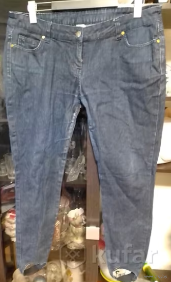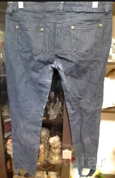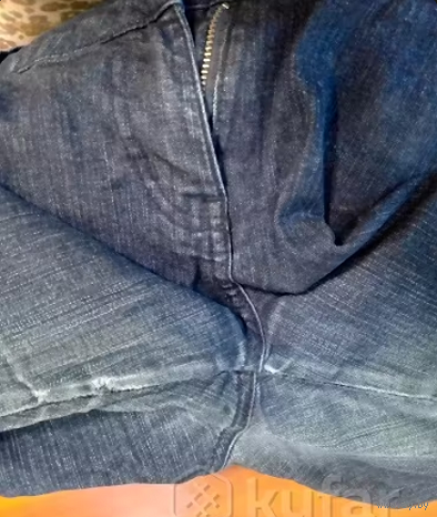 Фирменные джинсы, плотные, на р-р 50-52-54 (Евро 18), на фото постираны, но не поутюжены. ПОТ 48см, ПОБ 60см, длина сбоку 92см, внизу на широкой резинке (удобно, не вылезают из ботинок, сапог), посадка спереди 22см, сзади 33см. Цвет темно-синий. Из дефектов только небольшая потертость между ног - последнее фото), поэтому и цена символическая. Больше дефектов нет.