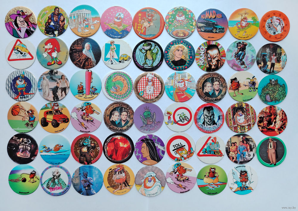 Фишки из 90-х Pog, Pocahontas, Barbie, Mortal combat, Sonic, Trafic, Power rangers..