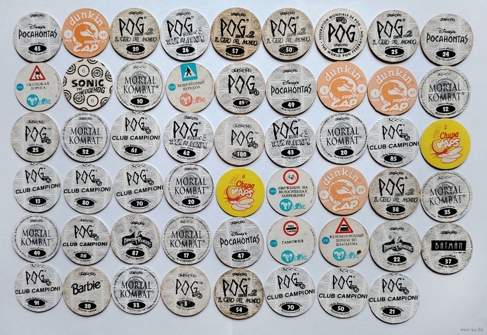 Фишки из 90-х Pog, Pocahontas, Barbie, Mortal combat, Sonic, Trafic, Power rangers..