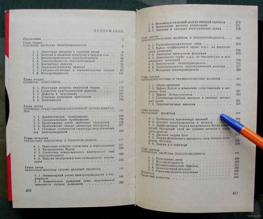 Книга представляет собой систематическое рассмотрение основных разделов физики полупроводников: качественного и количественного описания строения полупроводниковых кристаллов, энергетического спектра и статистики электронов и фононов, теории явлений переноса, оптических и фотоэлектических свойств и контактных явлений.