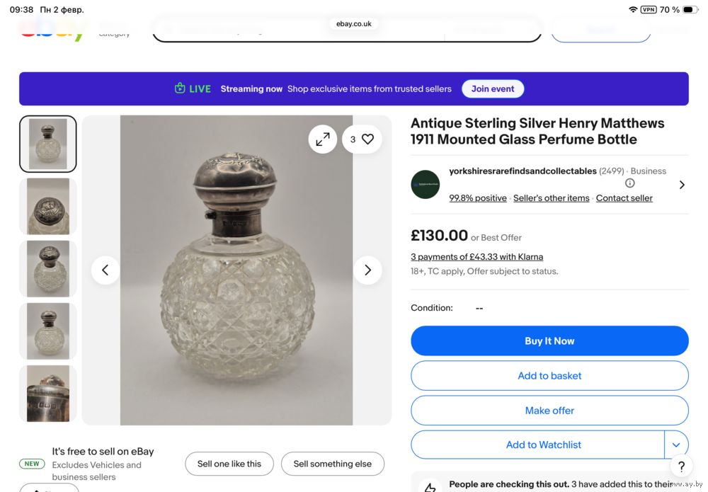 Антикварный флакон для духов, Честер , Англия 1900-й год, клейма-Лев , пшеница с мечом и буква R, также клеймо мастера GW, хорошая сохранность, смотрите фото, без сколов, небольшие вмятинки на крышке, отличный экземпляр для 100 + , высота 10 см