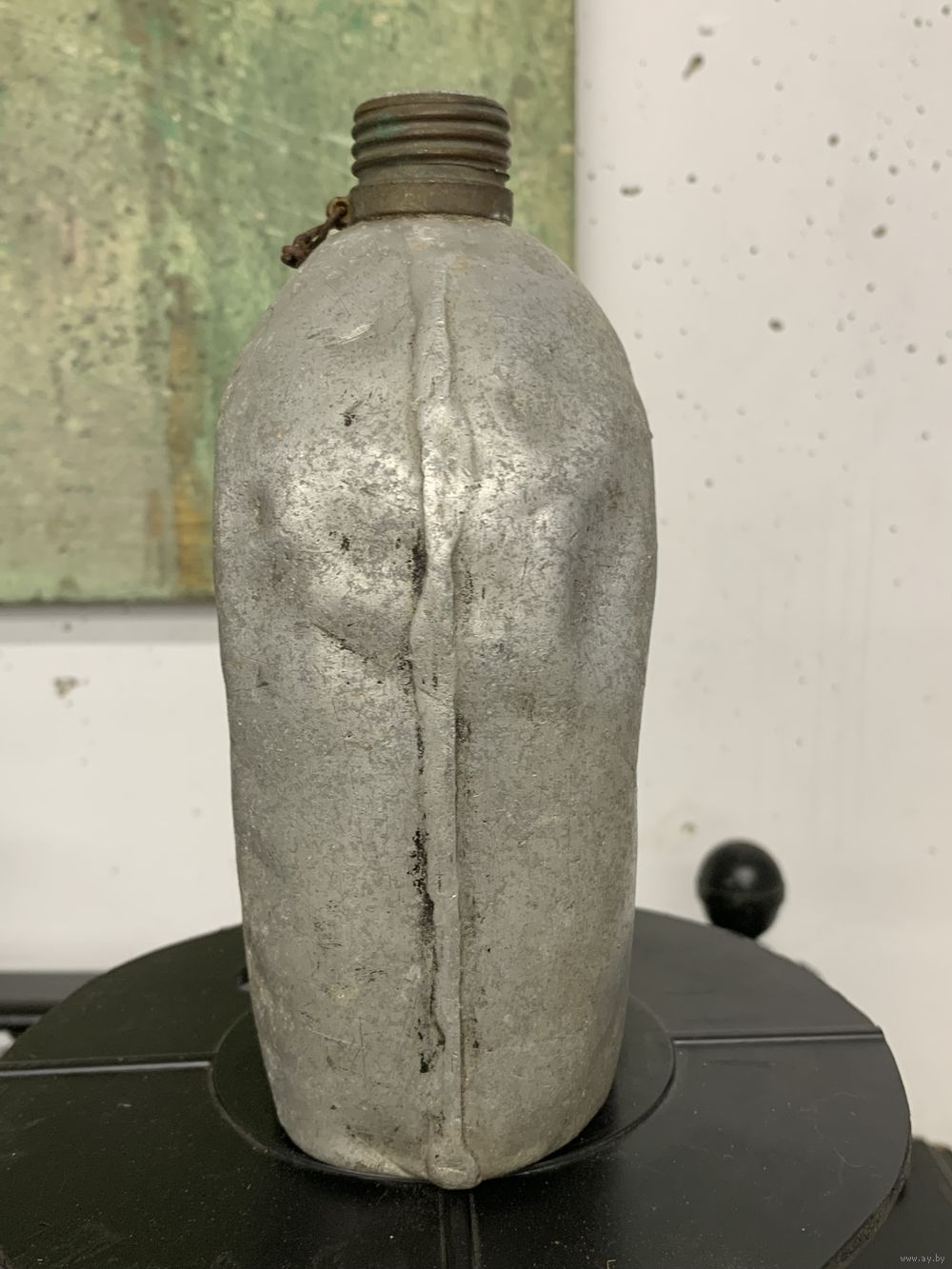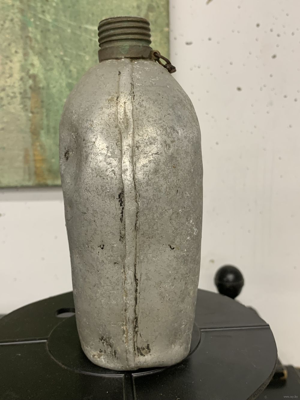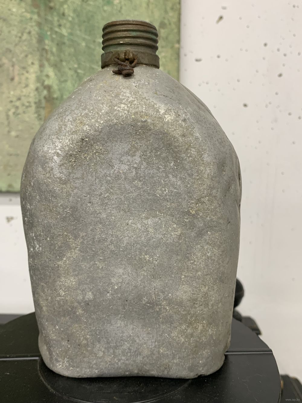 Фляга армейская М1910 год выпуска 191?, клеймо даты читается плохо, но есть. Алюминий, горлышко имеет латунную резьбу. Есть один свищ.