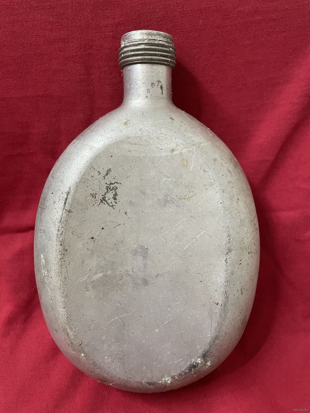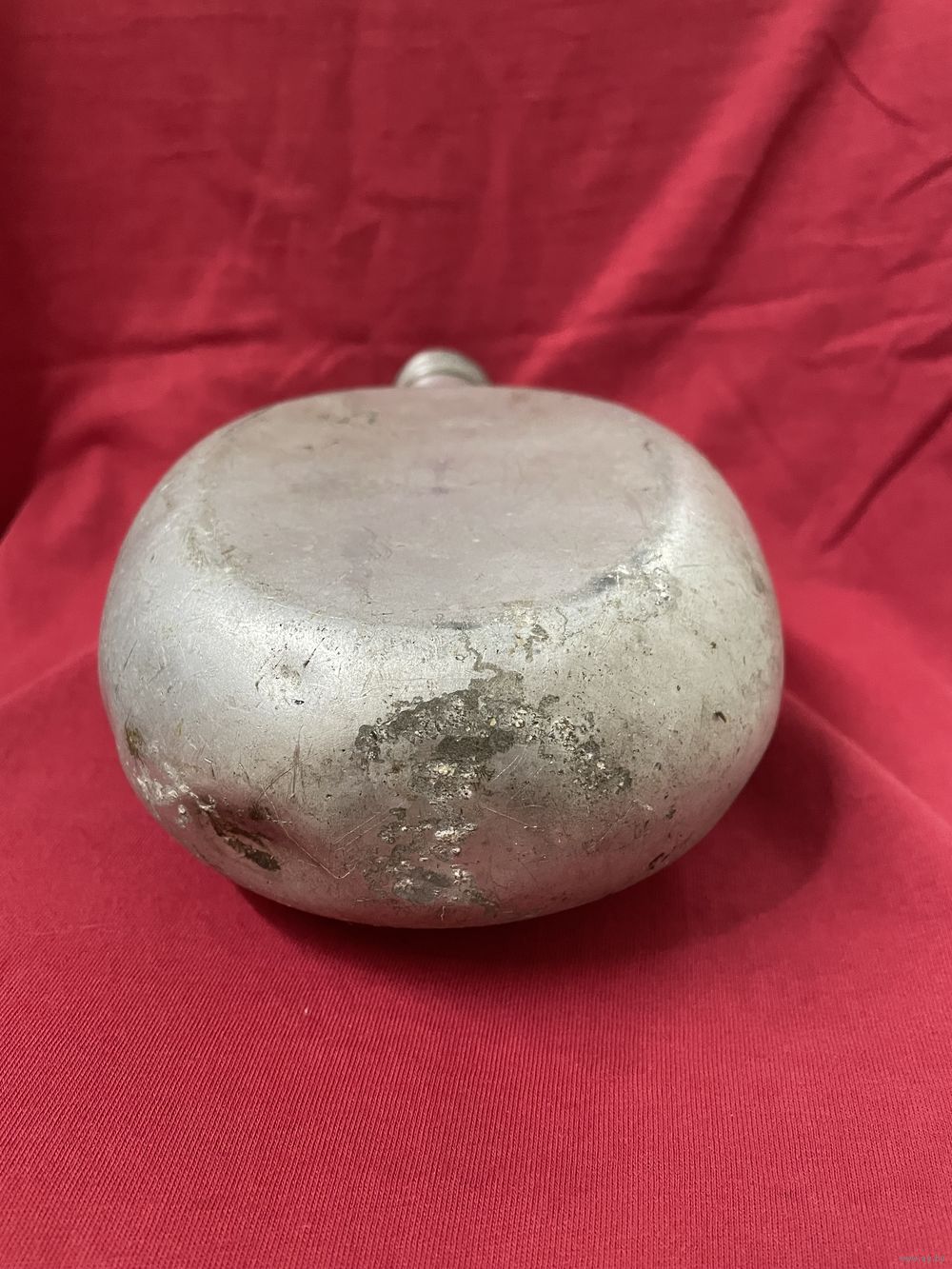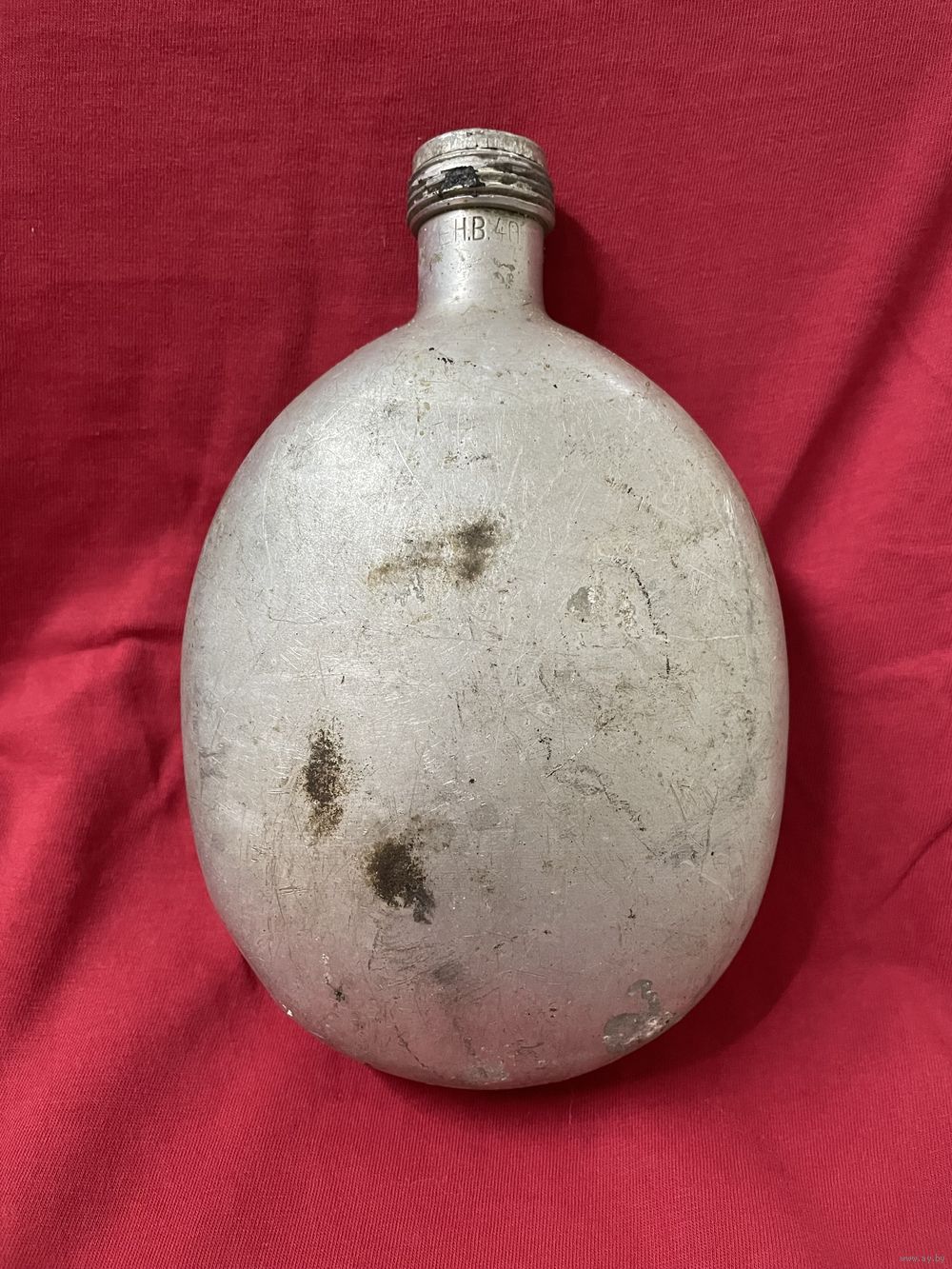 Фляга без свищей, небольшие вмятинки, воду держит. Внутри без постороннего запаха. Хранилась на чердаке. Клеймо E.H.B.40