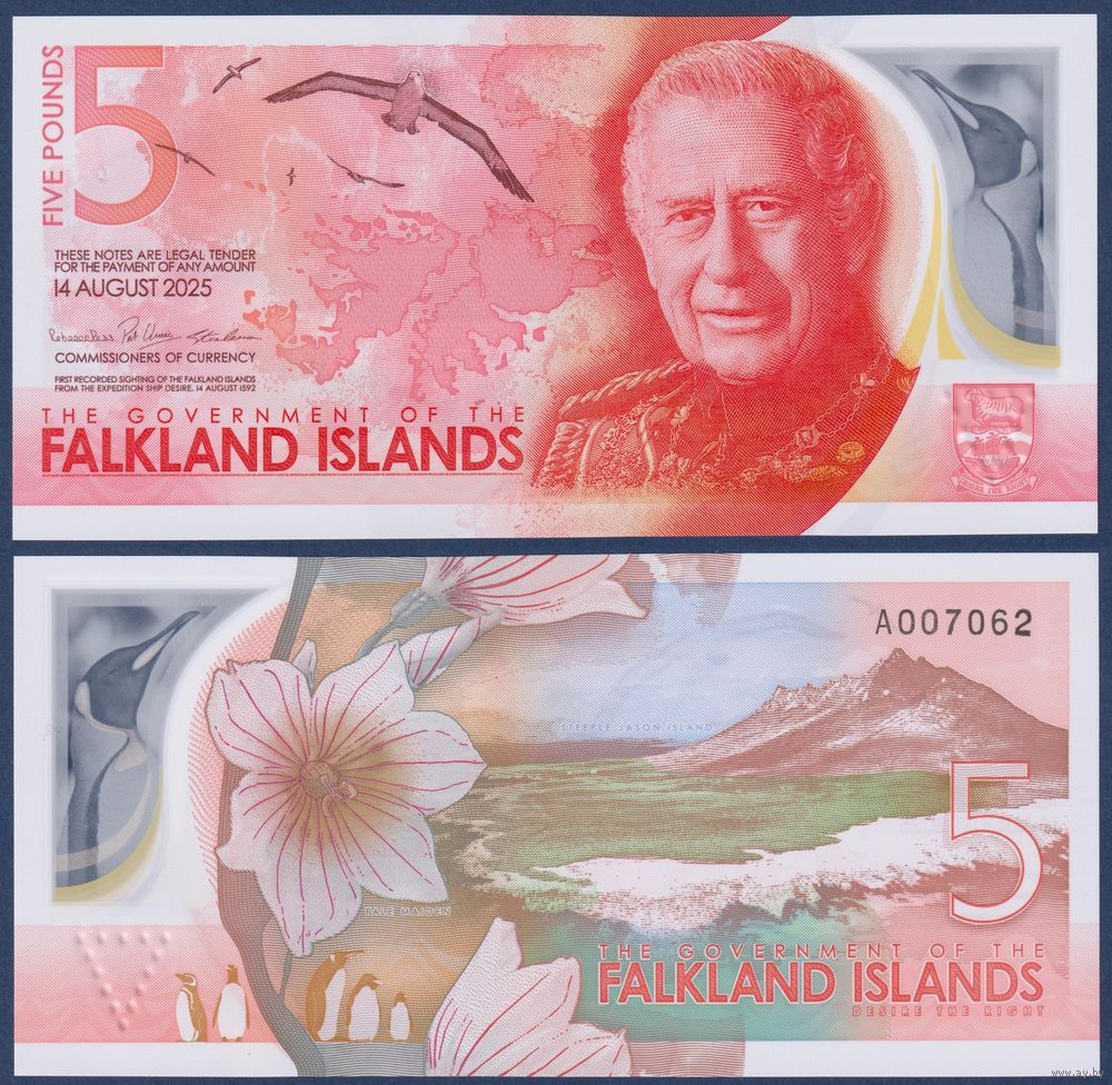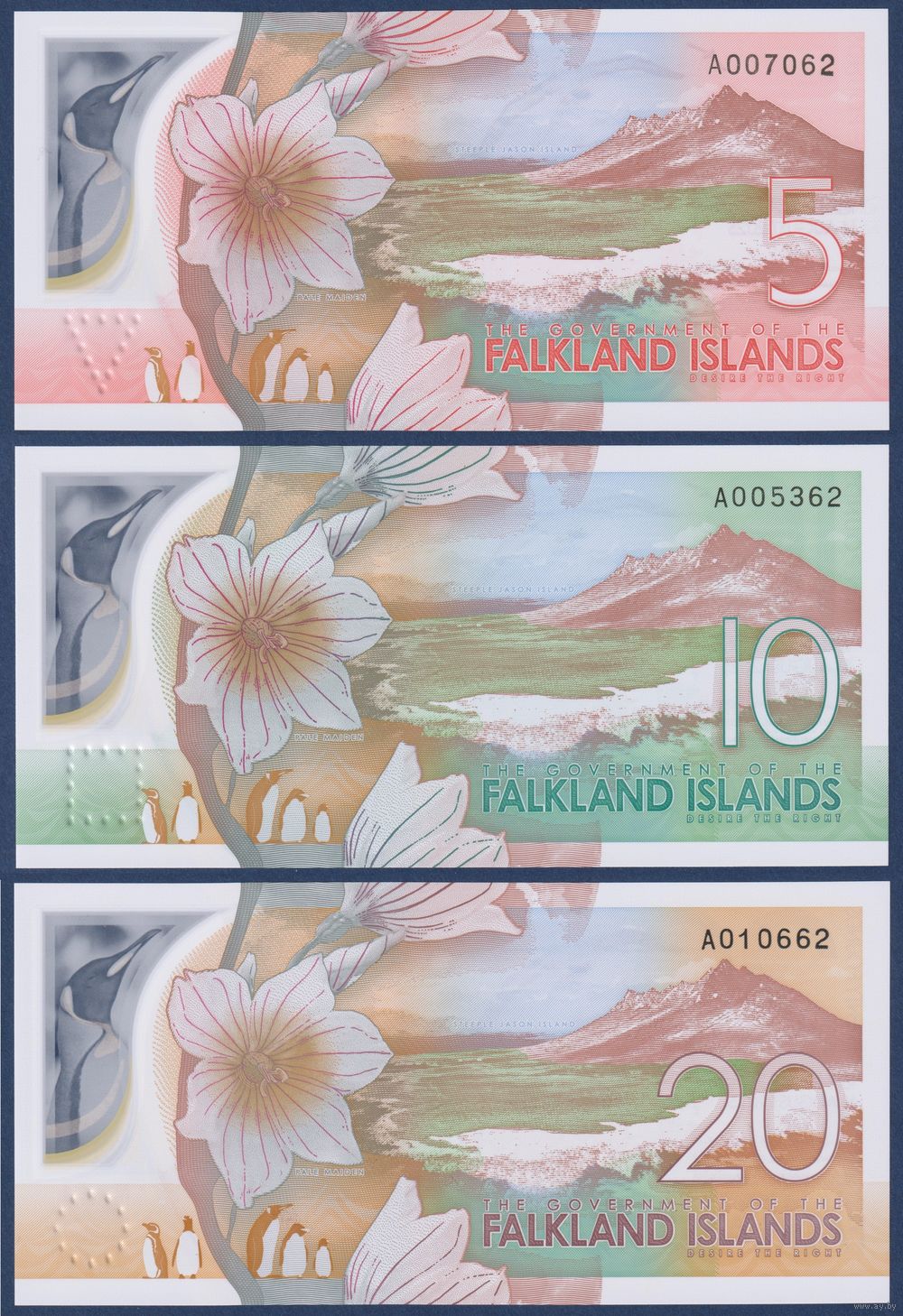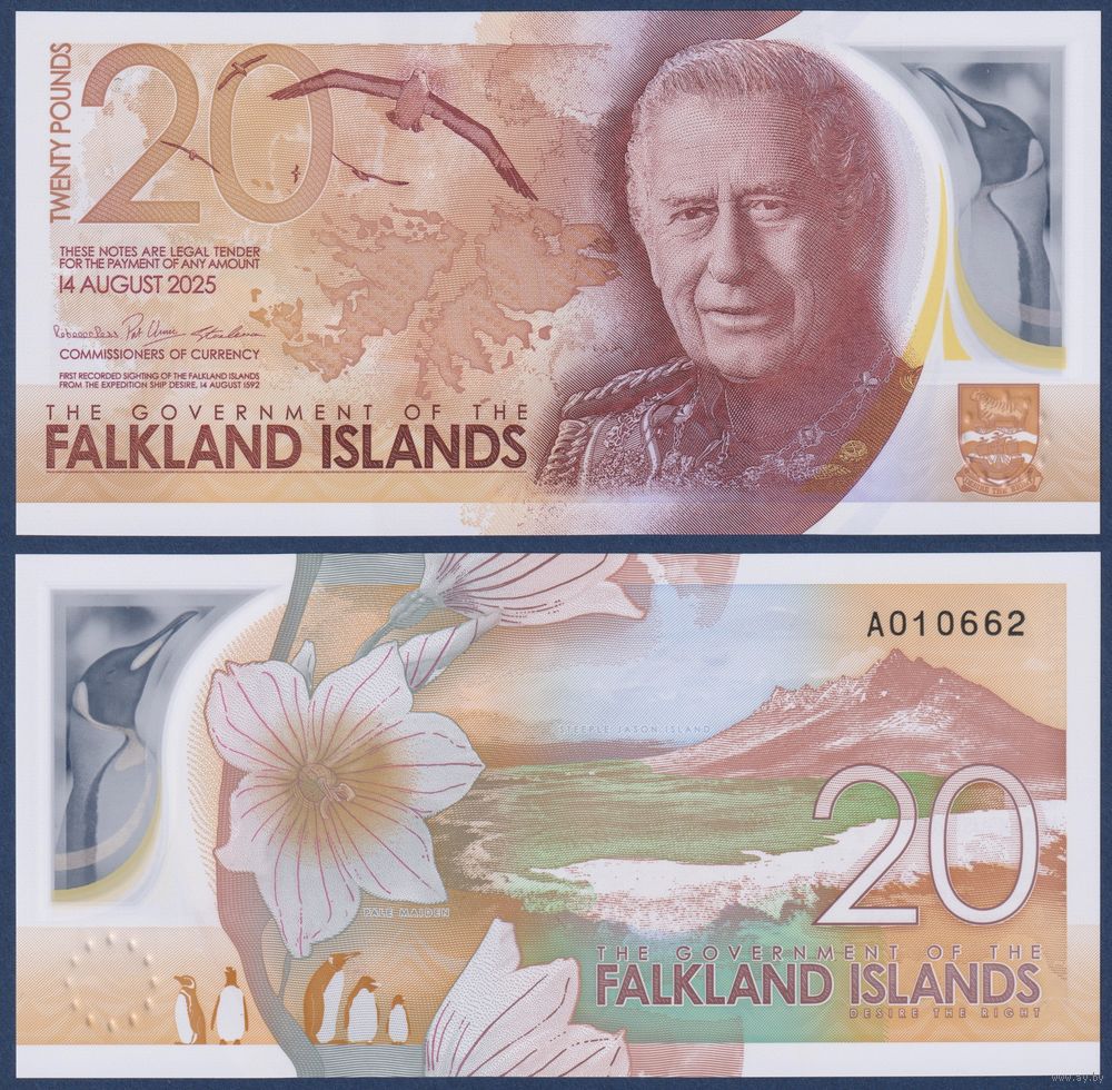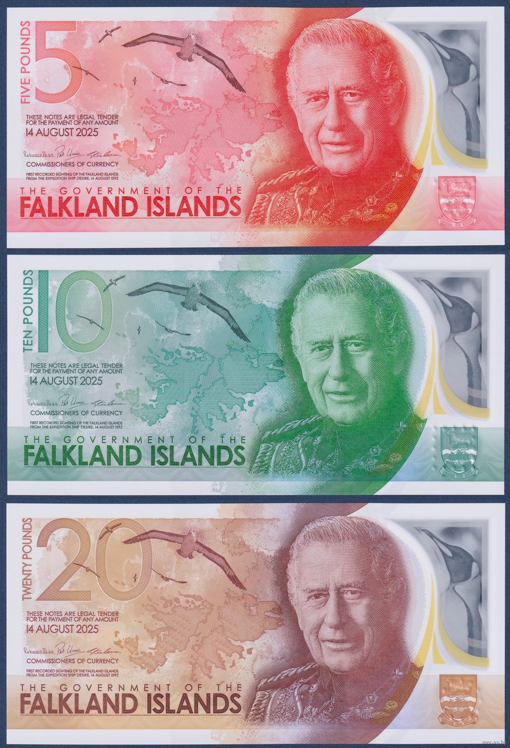 Фолклендские острова (Фолкленды), комплект 5 10 20 фунтов 2025 г. (A, король Карл III, одинаковые 2 цифры на конце номеров), UNC