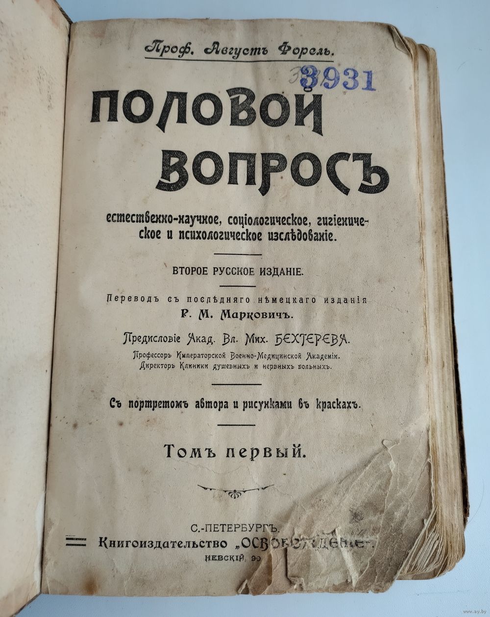 Форель Август. Половой вопрос. Естественно-научное, социологическое, гигиеническое и психологическое исследование. Второе русское издание. Перевод с последнего немецкого издания Р.М. Морковича. Предисловие акад. Вл. Мих. Бехтерева. Профессора Императорской военно-медицинской Академии. Санкт-Петербург: Книгоиздательство "Освобождение", 1910?г. Твёрдый переплёт, обычный формат.