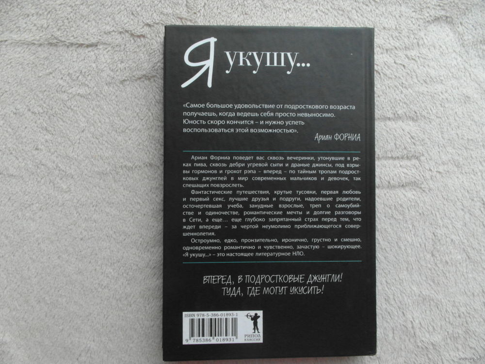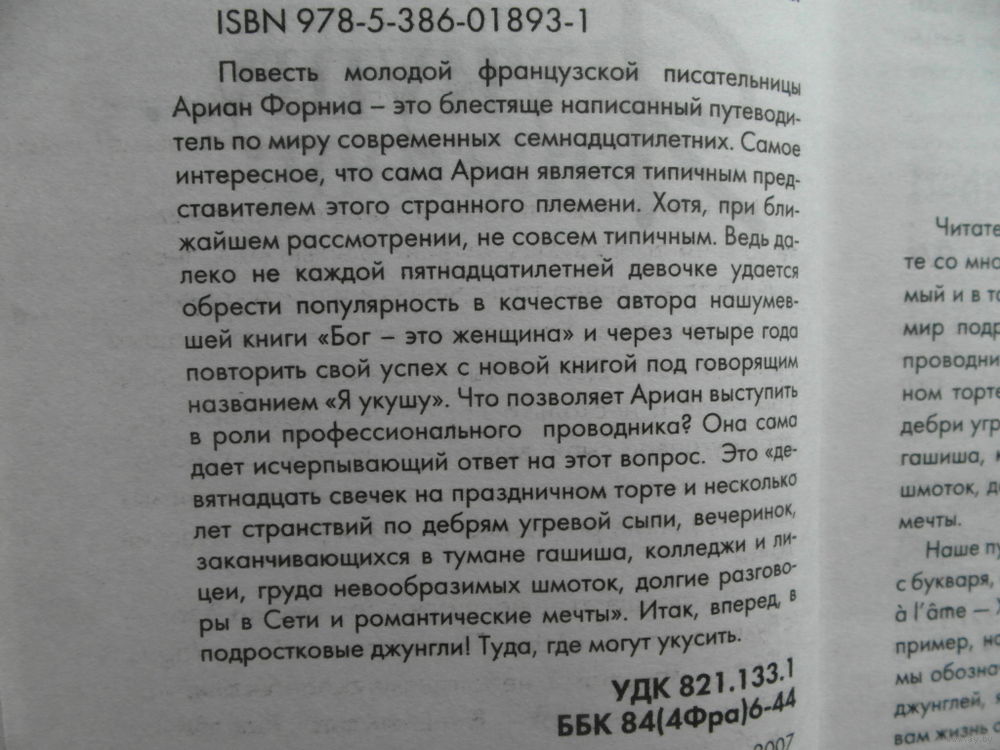 Повесть молодой французской писательницы Ариан Форниа - это блестяще написанный путеводитель по миру современных семнадцатилетних. Самое интересное, что сама Ариан является типичным представителем этого странного племени. Хотя, при ближайшем рассмотрении, не совсем типичным. Ведь далеко не каждой пятнадцатилетней девочке удается обрести популярность в качестве автора нашумевшей книги `Бог - это женщина` и через четыре года повторить свой успех с новой книгой под говорящим названием `Я укушу`. Что позволяет Ариан выступить в роли профессионального проводника? Она сама дает исчерпывающий ответ на этот вопрос. Это `девятнадцать свечек на праздничном торте и несколько лет странствий по дебрям угревой сыпи, вечеринок, заканчивающихся в тумане гашиша, колледжи и лицеи, груда невообразимых шмоток, долгие разговоры в Сети и романтические мечты`. Итак, вперед, в подростковые джунгли! Туда, где могут укусить.