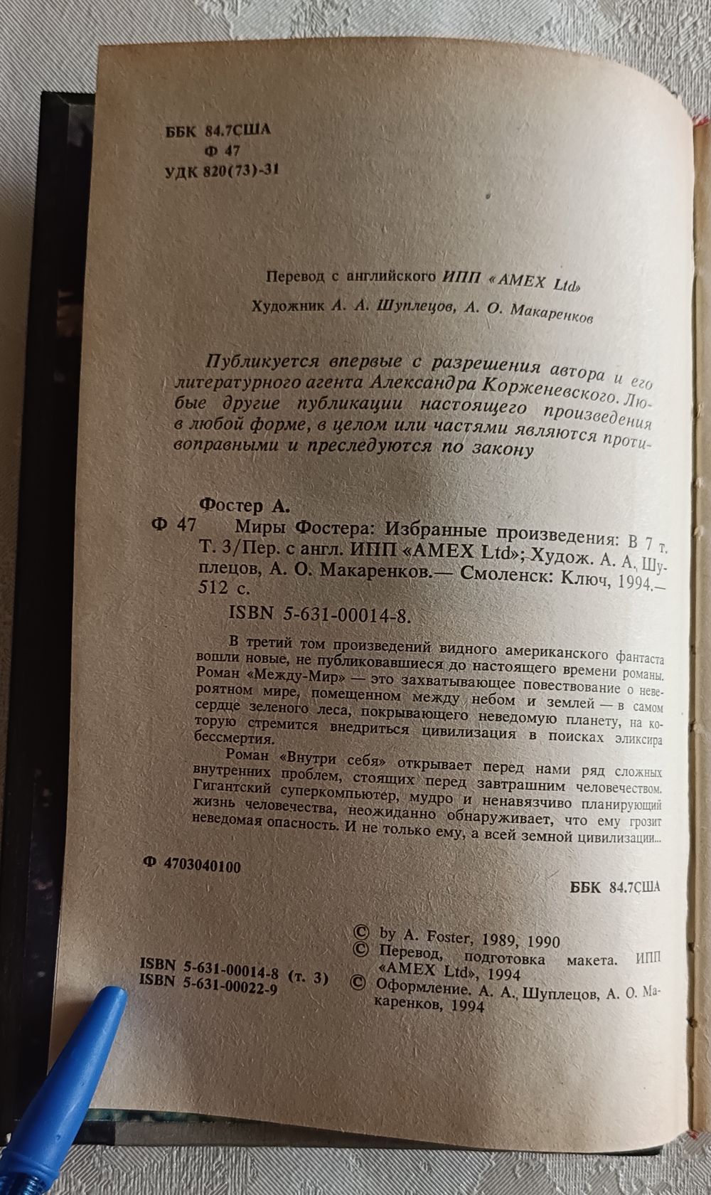 Фостер Алан Дин. Миры Фостера: Избранные произведения: В 7 т. Том 3. Между-мир/ Внутри себя. Смоленск: Ключ, 1994.-512 с., твердый переплет, обычный формат.