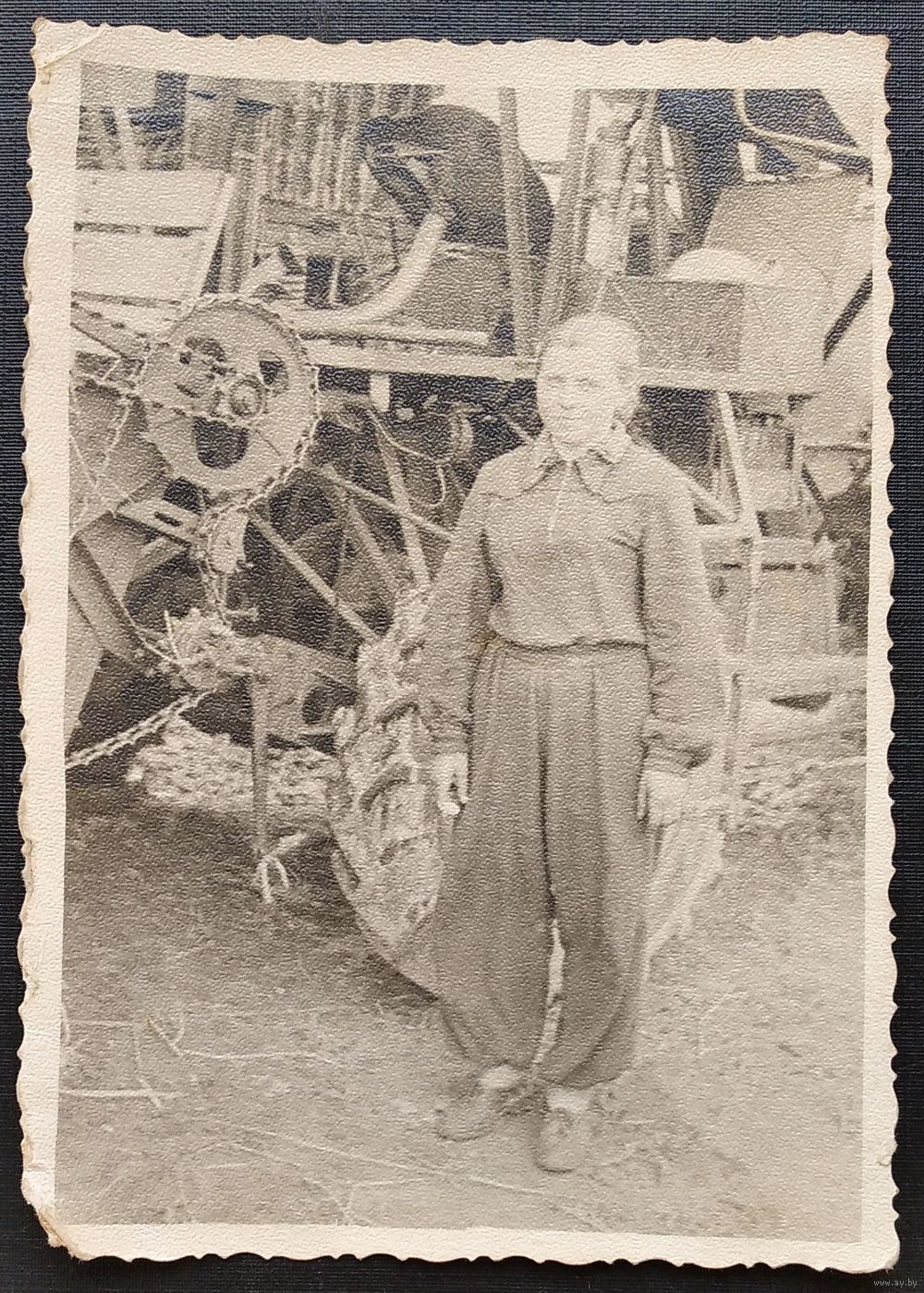 Фото девушки на фоне комбайна. 1957 г. 9х12 см.