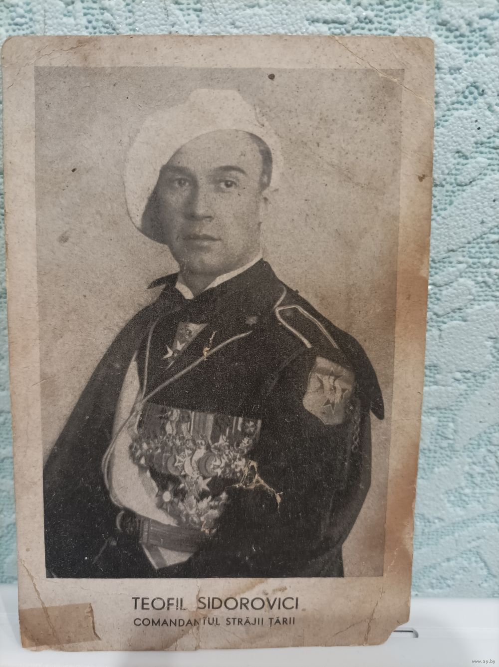 Карточка приблизительно 1930 года. Теофил Сидорович, майор королевской Румынии, фактический руководитель румынской молодежной военизированной организации "Страж родины", основанной в 1935 году королем Каролем II в противовес растущему влиянию "Железной гвардии" в среде молодежи Румынии. 3 декабря 1938 года, по установлении тотальной личной диктатуры короля Кароля II, эта организация стала единственной разрешенной молодежной организацией и все юноши в возрасте от 7 до 18 лет, и все девушки от 7 лет до 21 года обязаны были состоять в ней. Основными задачами организации являлись: патриотическое воспитание, спортивная и начальная военная подготовка, всяческое содействие укреплению культа личности короля Кароля II. И, хоть короля часто называли "Великий Страж", фактическое руководство организацией осуществлял Теофил Сидорович.