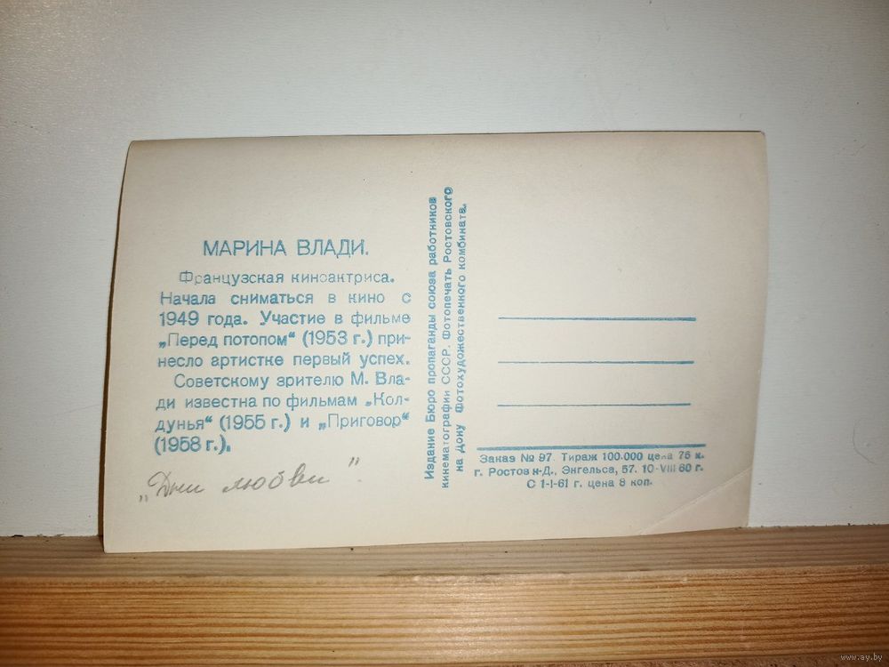 Фото открытка Марина Влади. 1960 г. Состояние отличное. Могу выслать по почте или Европочтой