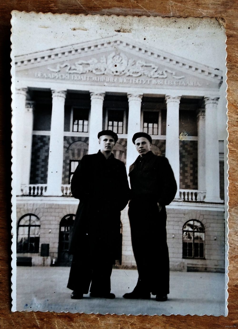 Фото у главного корпуса Белорусского политехнического института им. Сталина. (БПИ). Минск. 1950-е. 8х11.5 см.