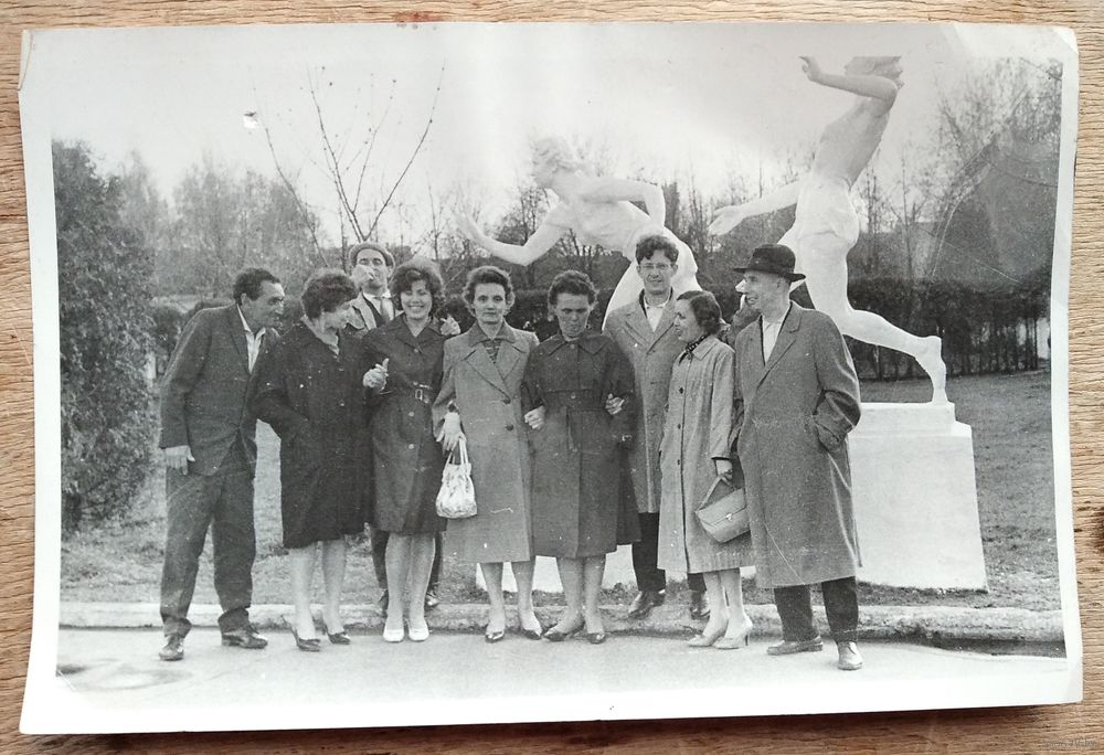 Фото у скульптуры в сквере стадиона "Динамо" Минск. 1950-60-е. 12х18 см.