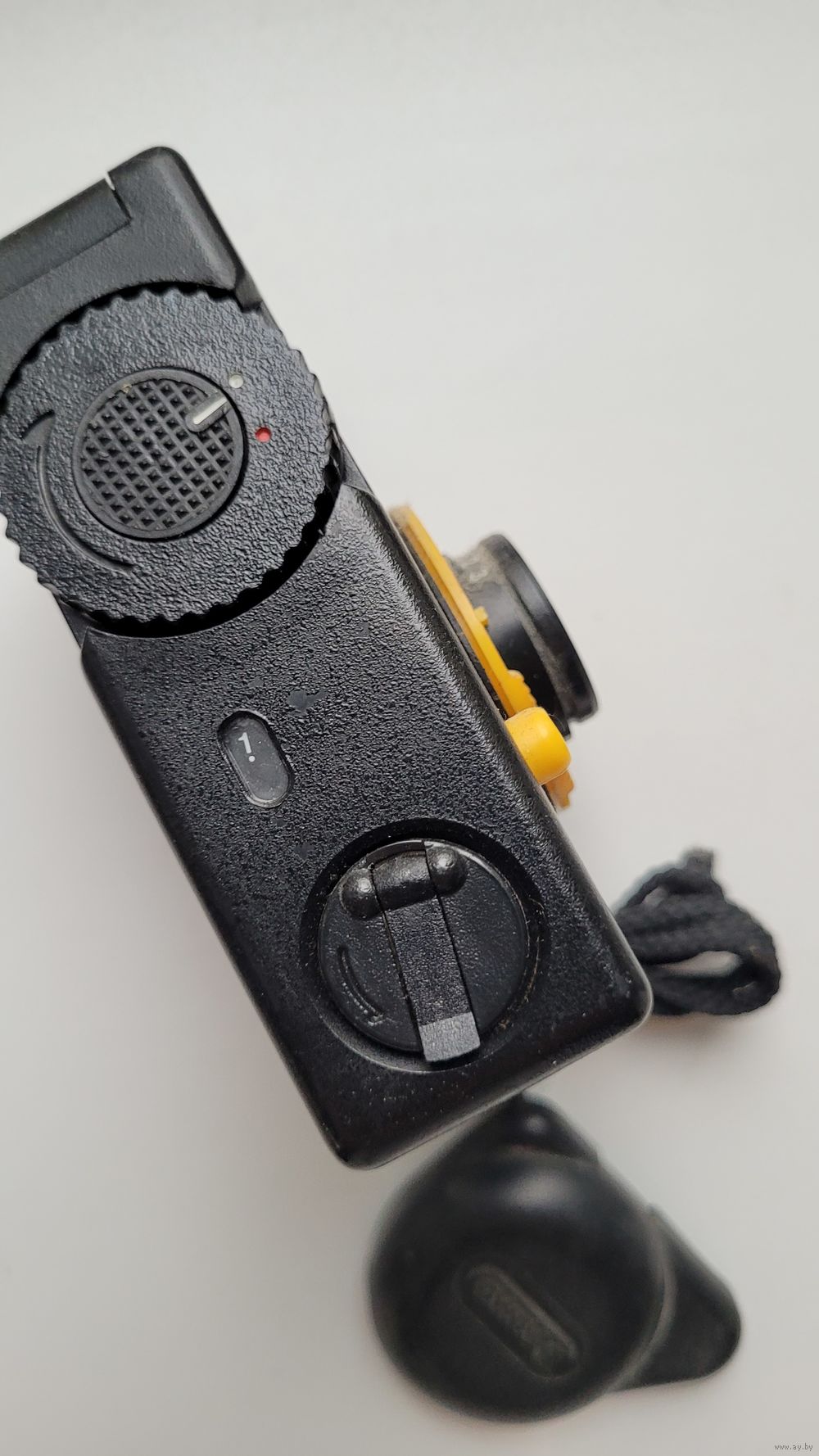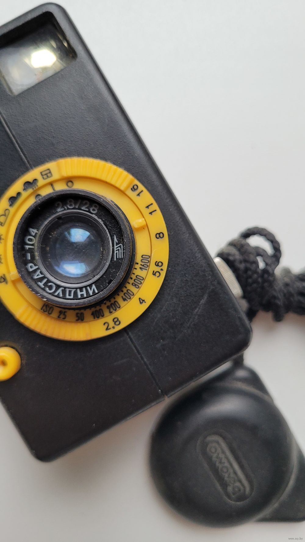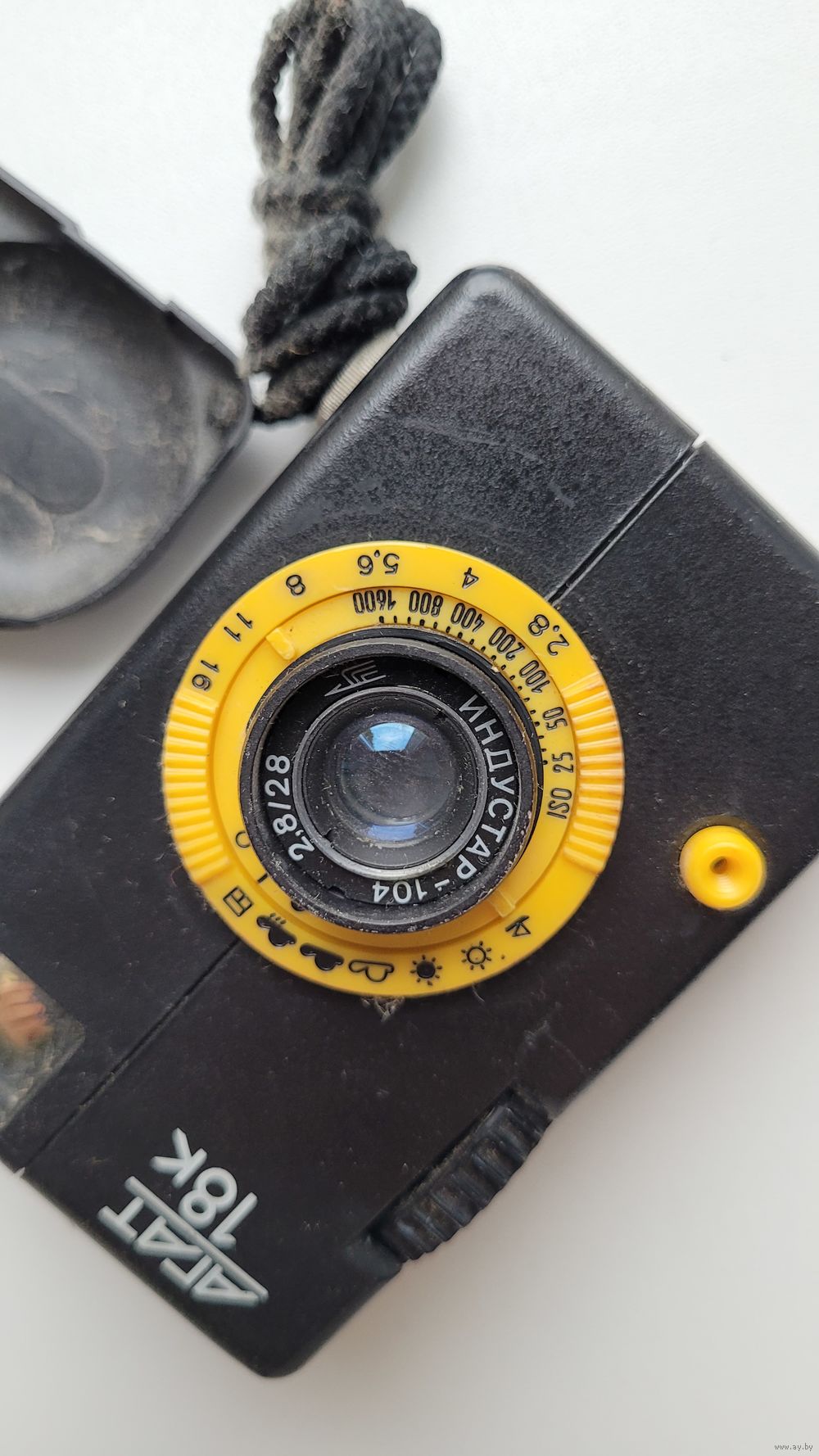 Советский шкальный полуформатный фотоаппарат Агат 18К. Произведен на заводе Зенит в 1988 году. Комплект в коробке. Корпус фотоаппарата пластмассовый разъёмный, зарядка 35-мм фотоплёнкой в стандартных кассетах. Взвод затвора сблокирован с перемоткой плёнки, счётчик кадров — автоматический. Объектив «Индустар-104» 2,8/28, несъёмный. Наводка на резкость по шкале расстояний от 0,9 м до бесконечности. Имеется шкала глубины резкости в виде выемок обоймы объектива. Разрешающая способность : 40 лин/мм в центре кадра, 22 лин/мм по краям. Установка экспозиции — ручная по символам погоды. Видоискатель камеры имеет запас по полю зрения. Агат 18К - настоящая камера шпиона, он настолько маленький, что способен поместиться абсолютно в любой карман. .