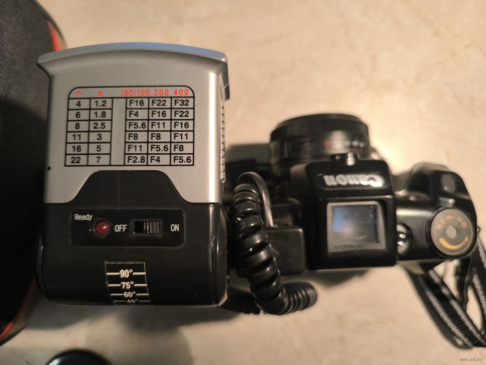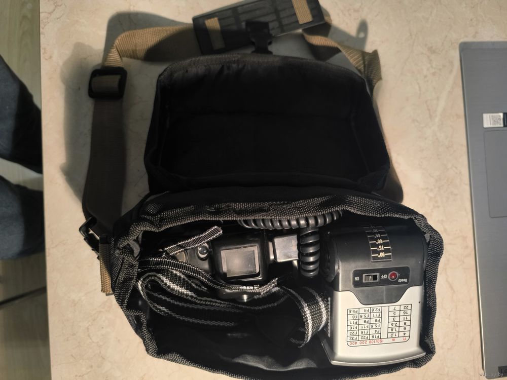 В комплекте: сам фотоаппарат, вспышка, кофр.