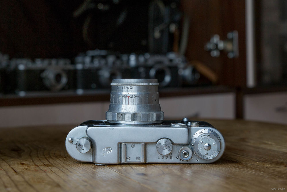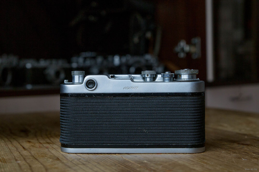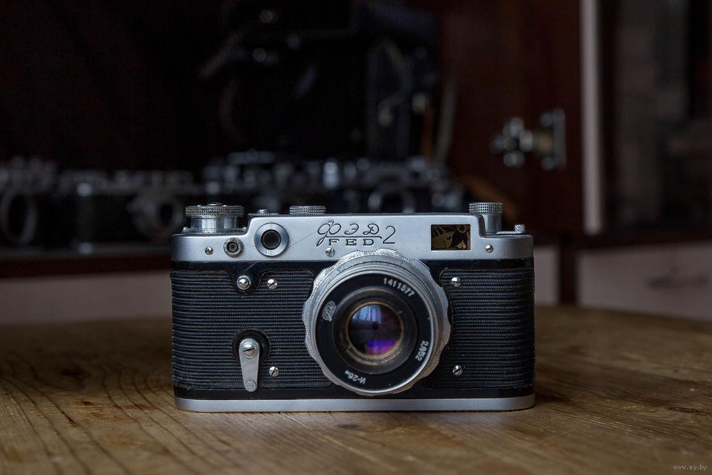 Не частый вариант фотоаппарата ФЭД 2 с оклейкой корпуса в "рубчик" и надписью "Made in USSR" на верхней крышке.