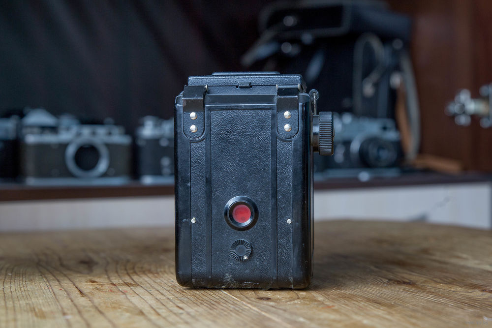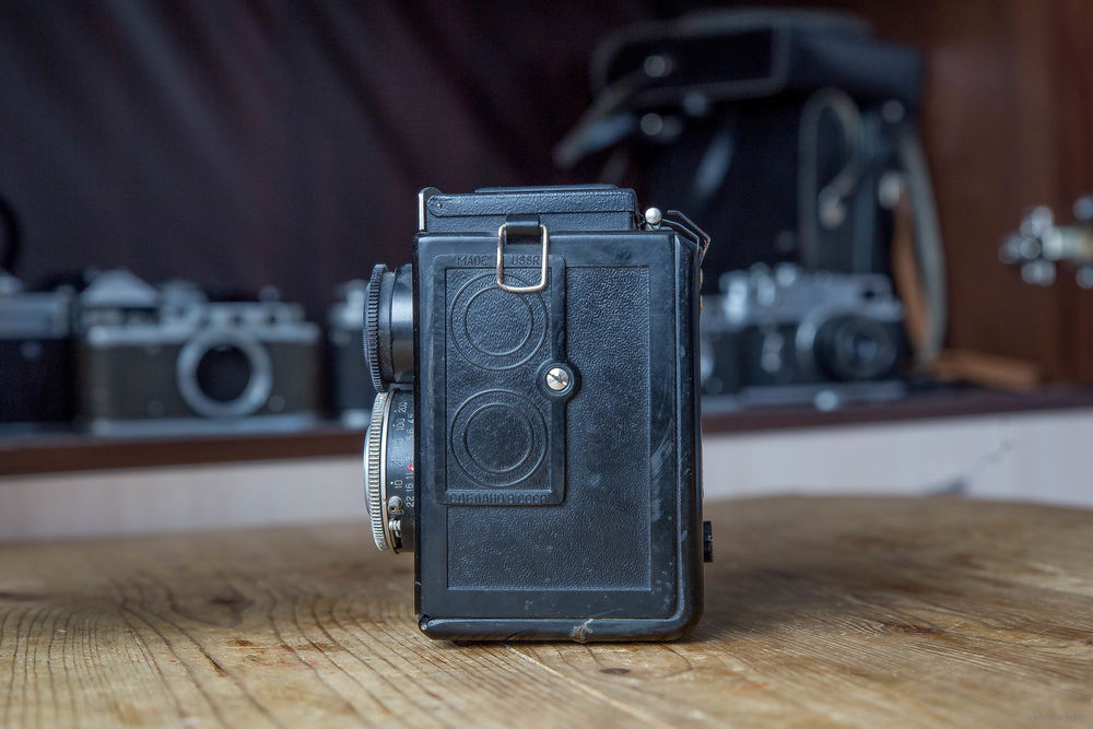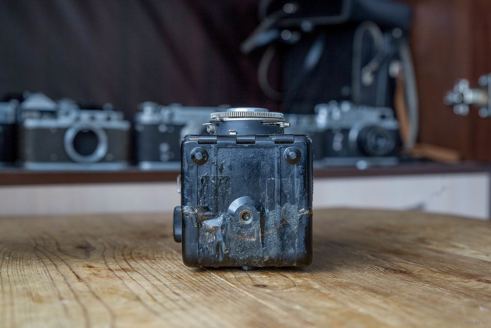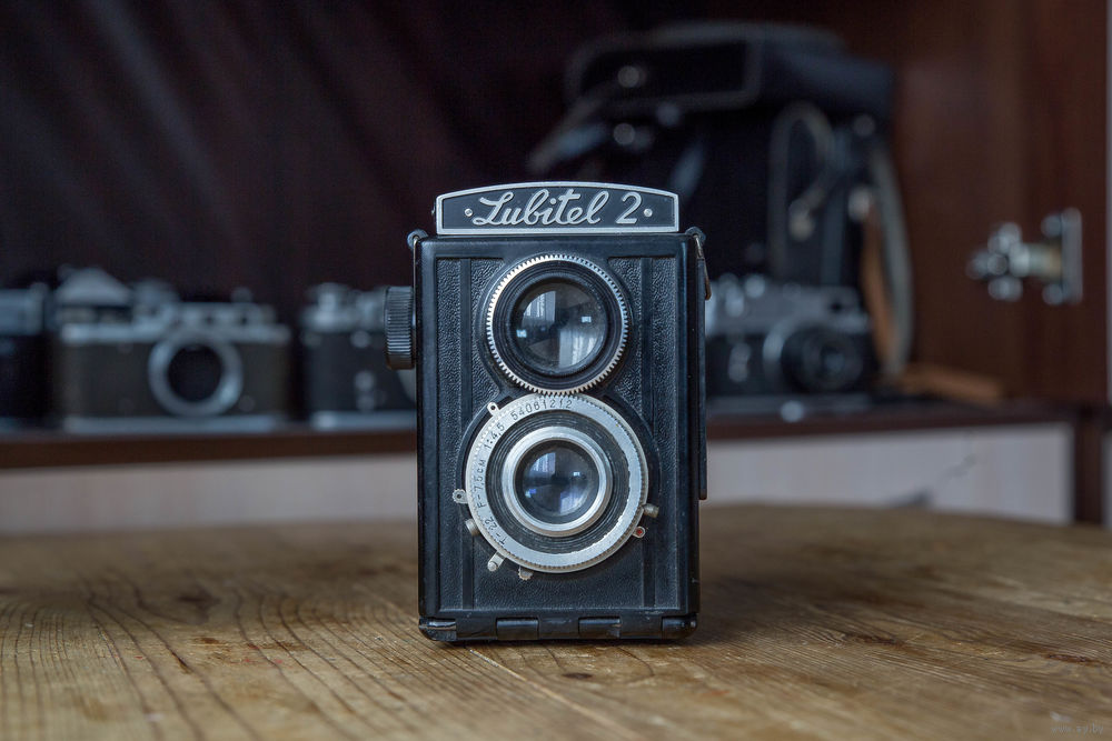 Фотоаппарат Любитель 2, с надписью на латинице. Задняя крышка склеена снизу, затвор подтормаживает. Продается на запчасти.