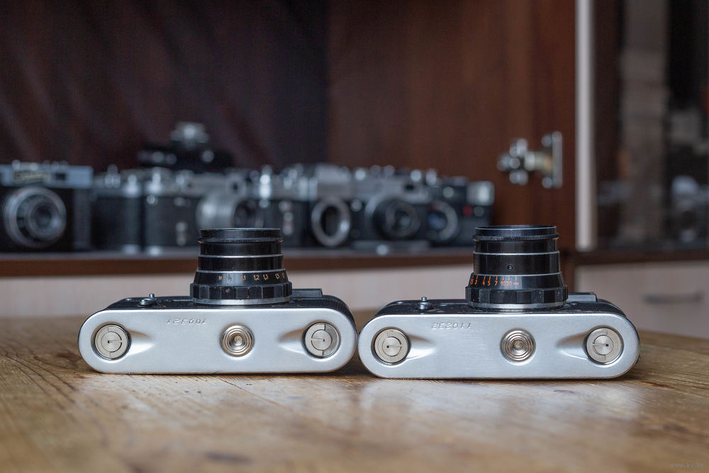 У камеры (справа на фото), затвор срабатывает, но насколько точно, сказать не могу. С пленкой не проверялся. Из недостатков: потрепан кожзам на торце задней крышки.